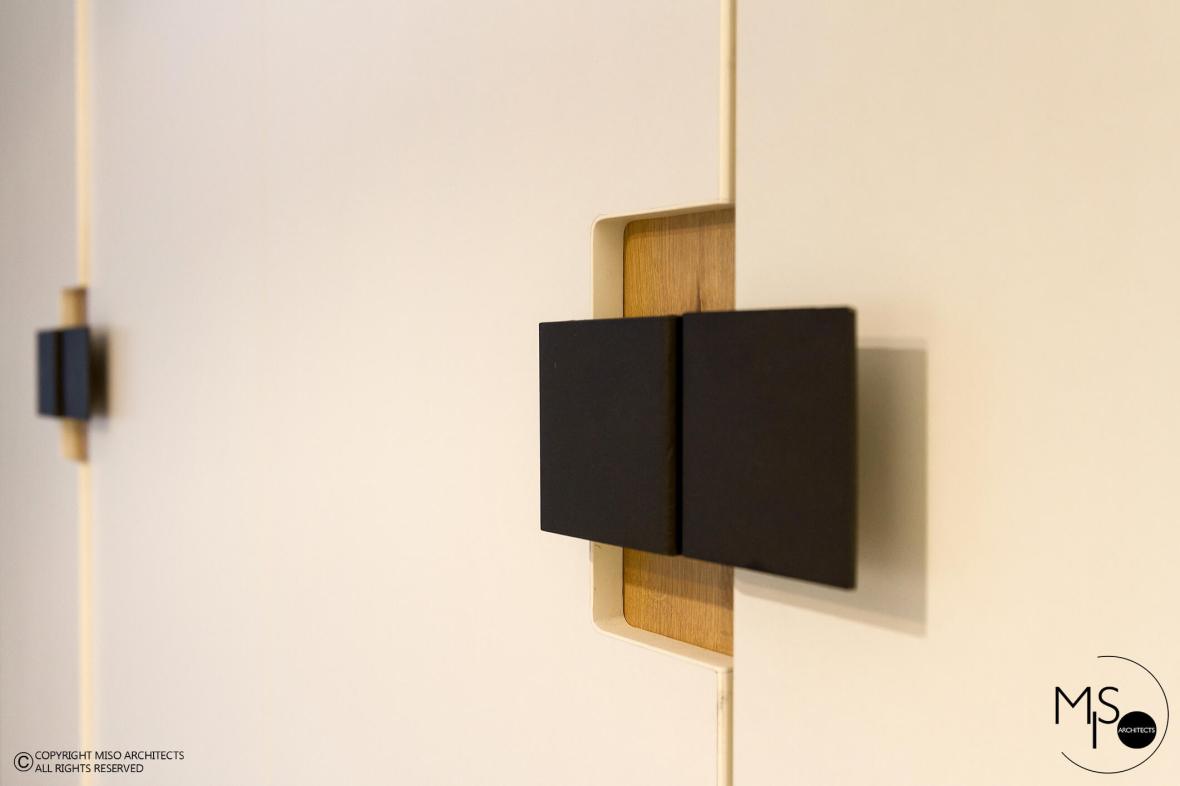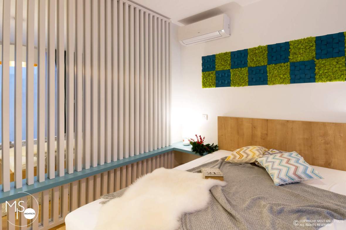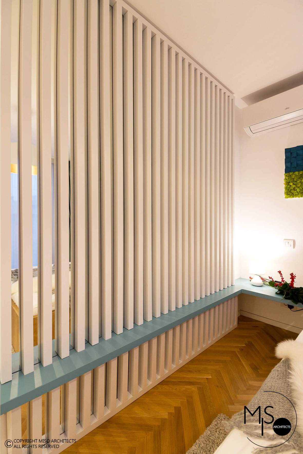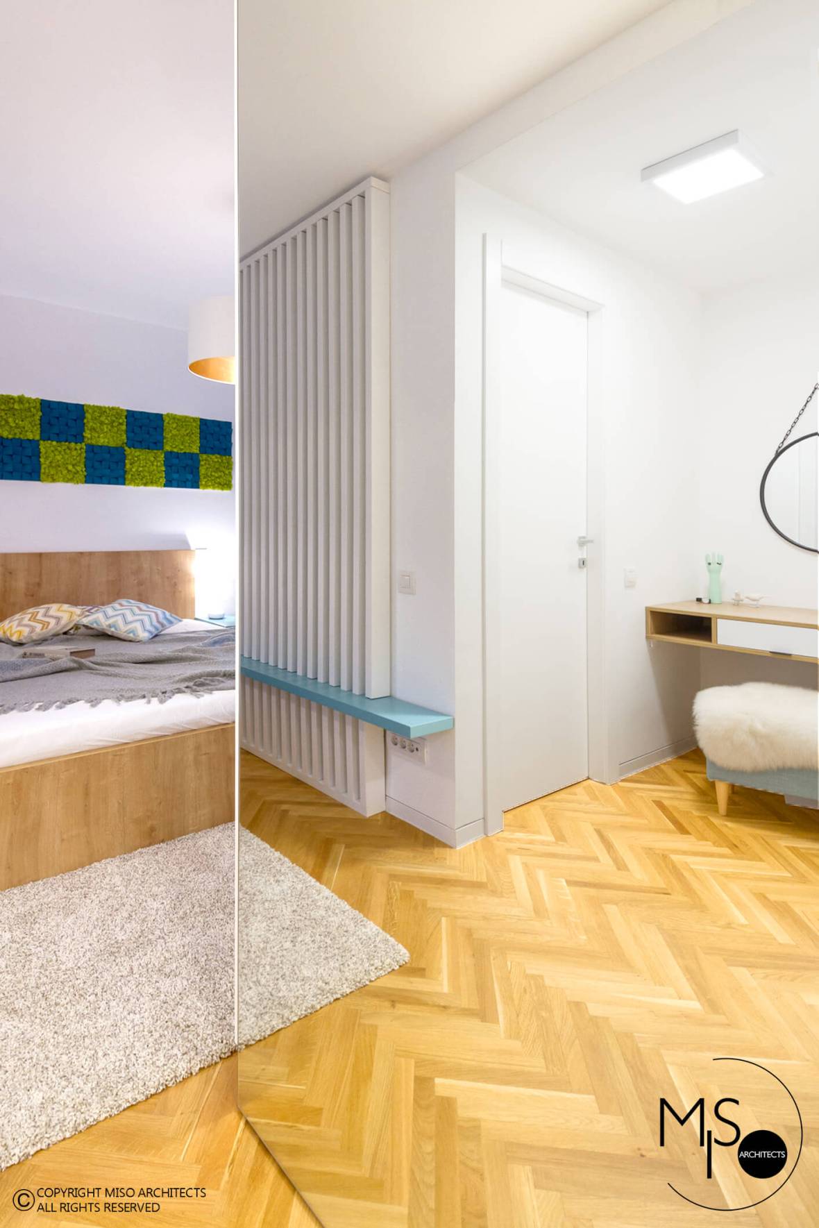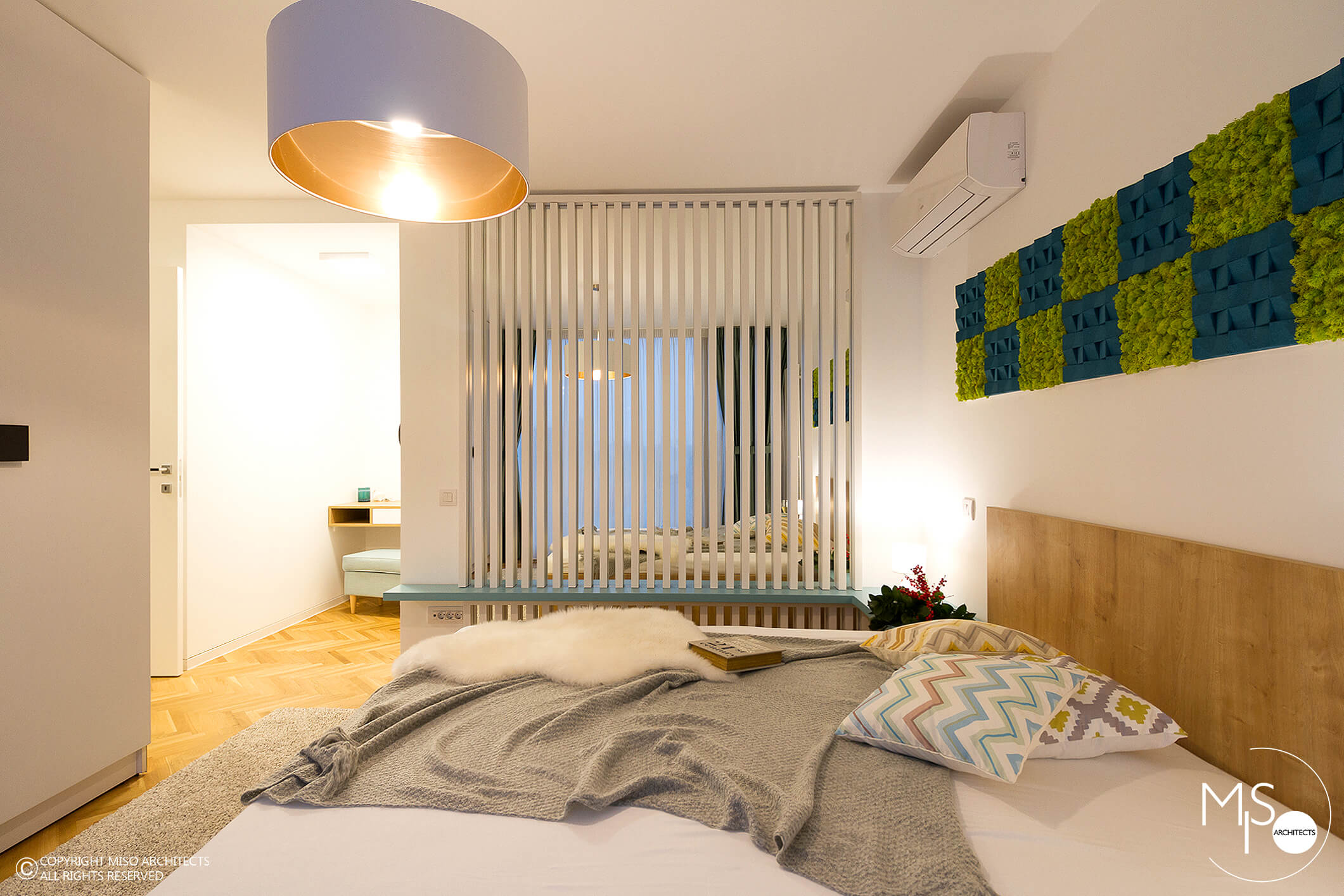 Dormitorul matrimonial înglobează şi o zonă de machiaj şi dressing, mânerele dulapului fiind elemente deosebite realizate din plăcuţe de metal îmbinate cu lemn. În zona patului am dorit să creăm iluzia de spaţiu mai mare şi ne-am jucat cu lamele albe îmbinate cu fâşii de oglindă, străbătute de un blat care aduce astfel culoarea din living în zona de noapte.