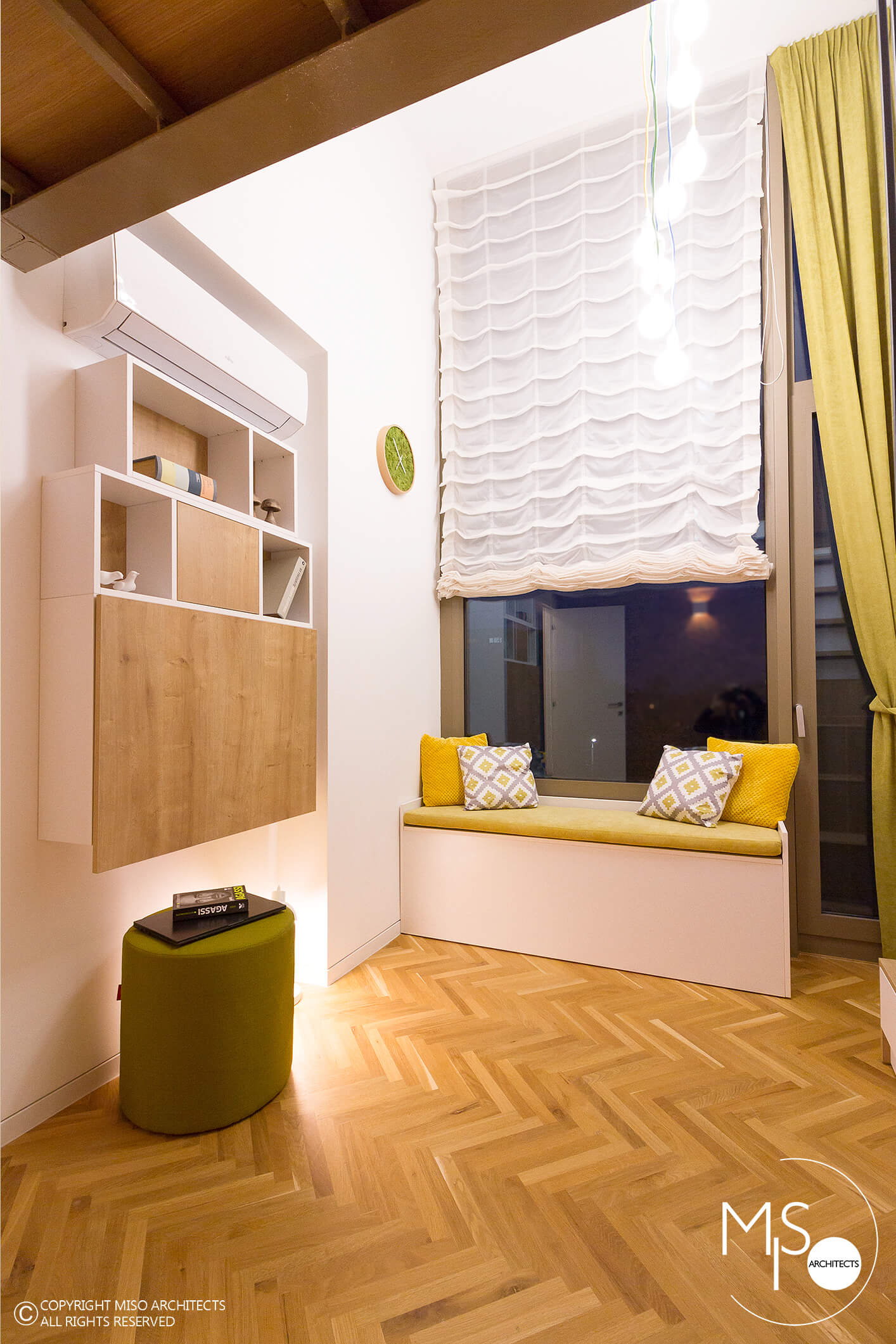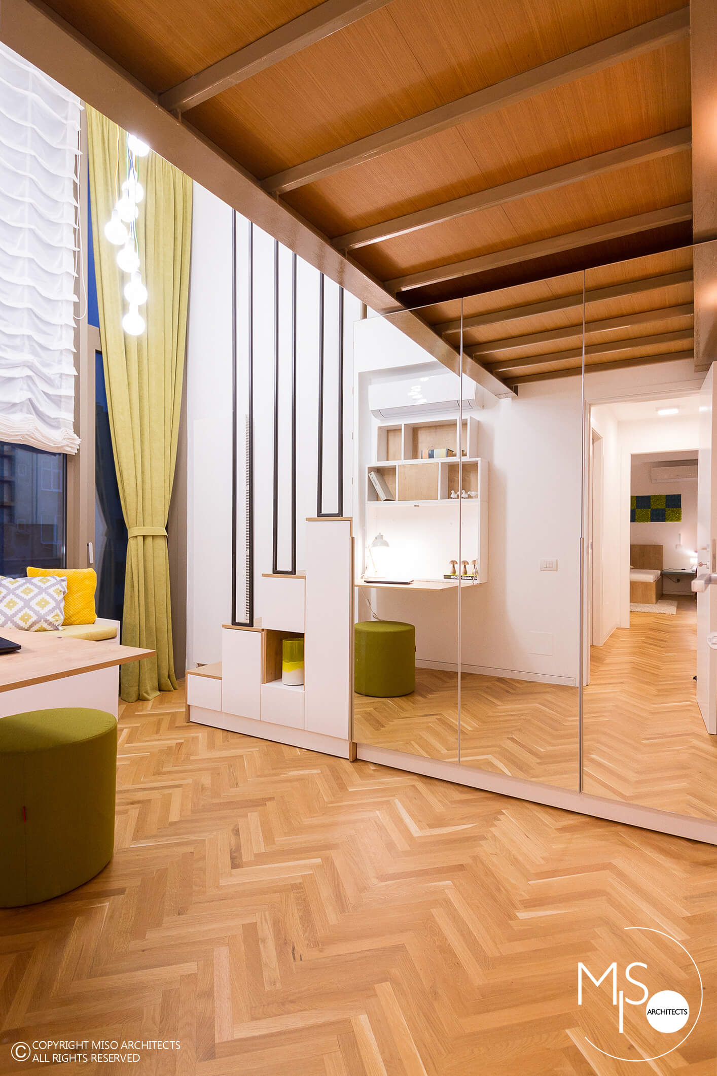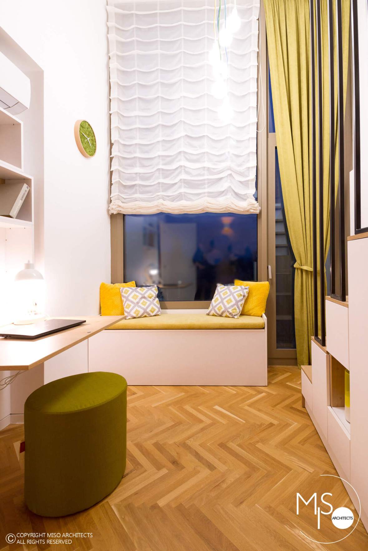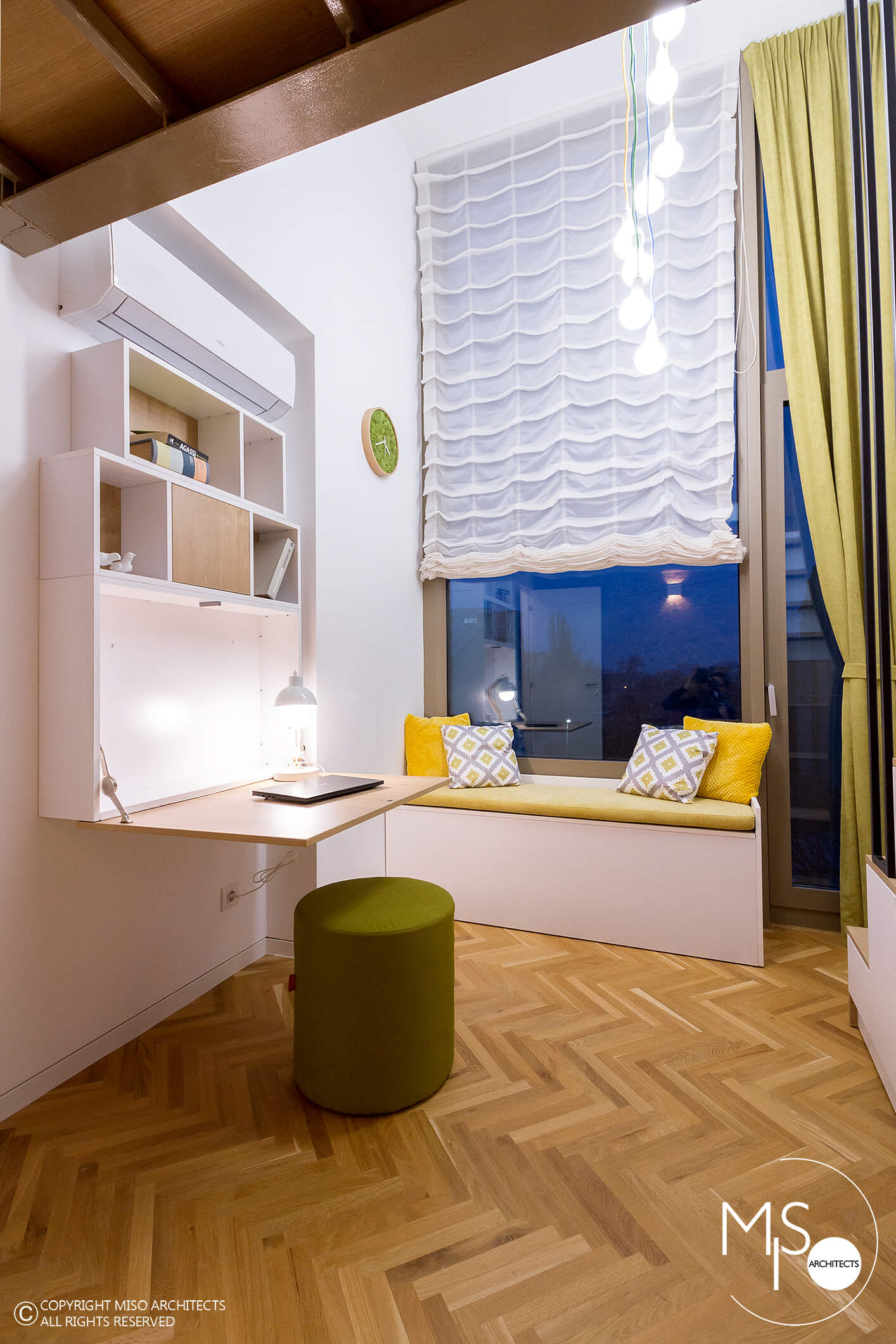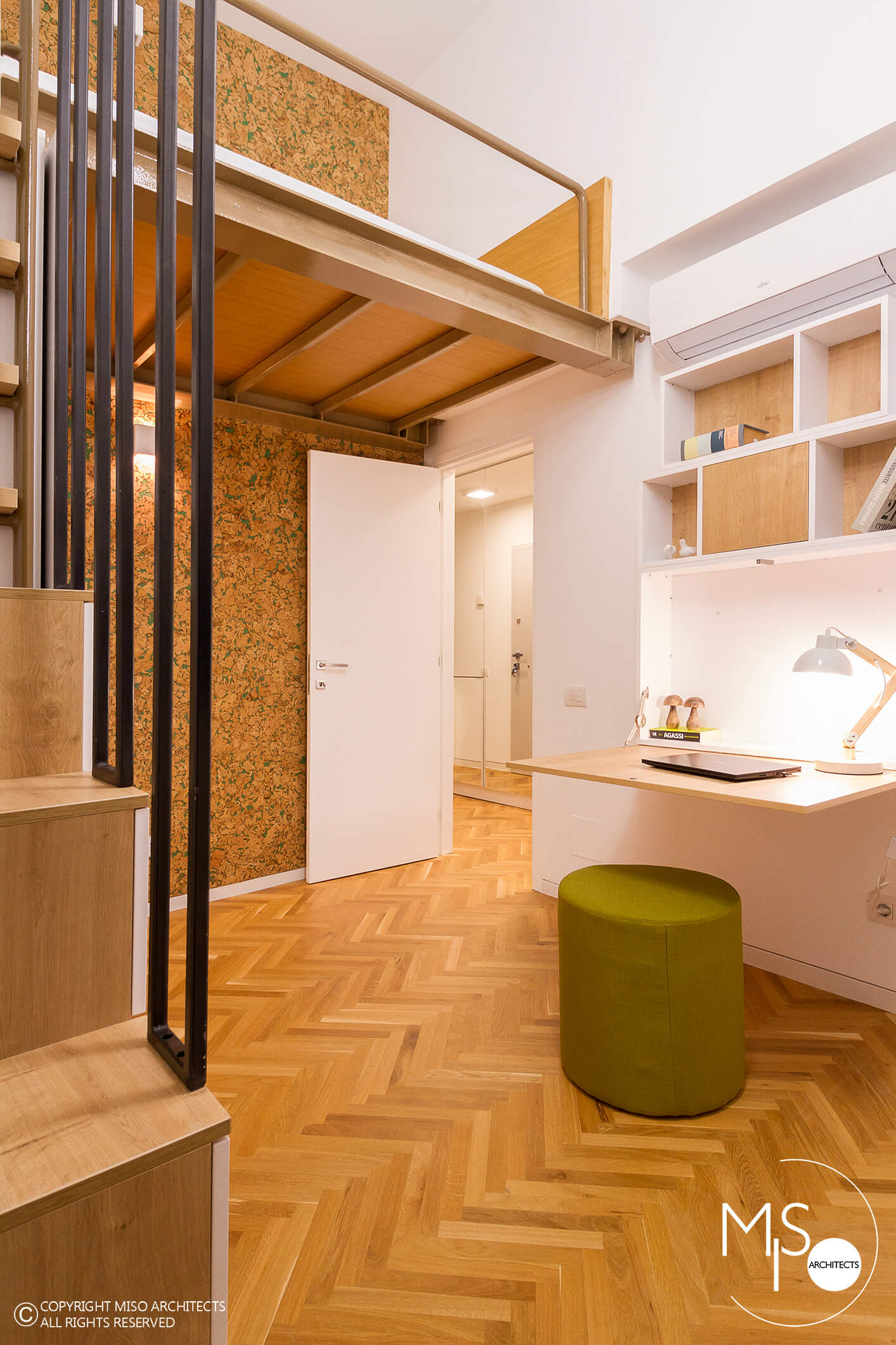 Apartamentul a fost achiziţionat la începutul verii de către proprietarii care nu locuiesc în Bucureşti, cu scopul de a fi închiriat şi folosit ulterior de fiica lor plecată din ţară la momentul de faţă. Câteva aspecte cheie fac acest apartament foarte atractiv atât ca locuinţa cât şi ca investiţie, în primul rând poziţia chiar în centrul oraşului, nivelul ridicat de confort al imobilului şi a finisajelor acestuia, precum şi faptul că accesul în locuință se face nu doar pe scări, dar şi printr-un lift care se deschide direct în apartament cu comanda electronică. De asemenea, un element distinctiv este dormitorul cu platformă suspendată cu înălţimea totală de 4 m, care are un farmec aparte şi este cu totul ieşit din comun pentru un apartament de bloc. Amenajarea a fost realizată de echipa Miso Architects. Mai multe detalii la finalul articolului.