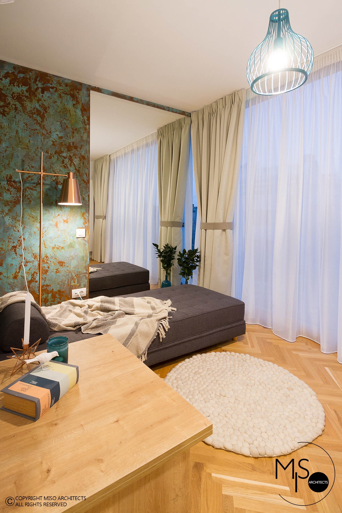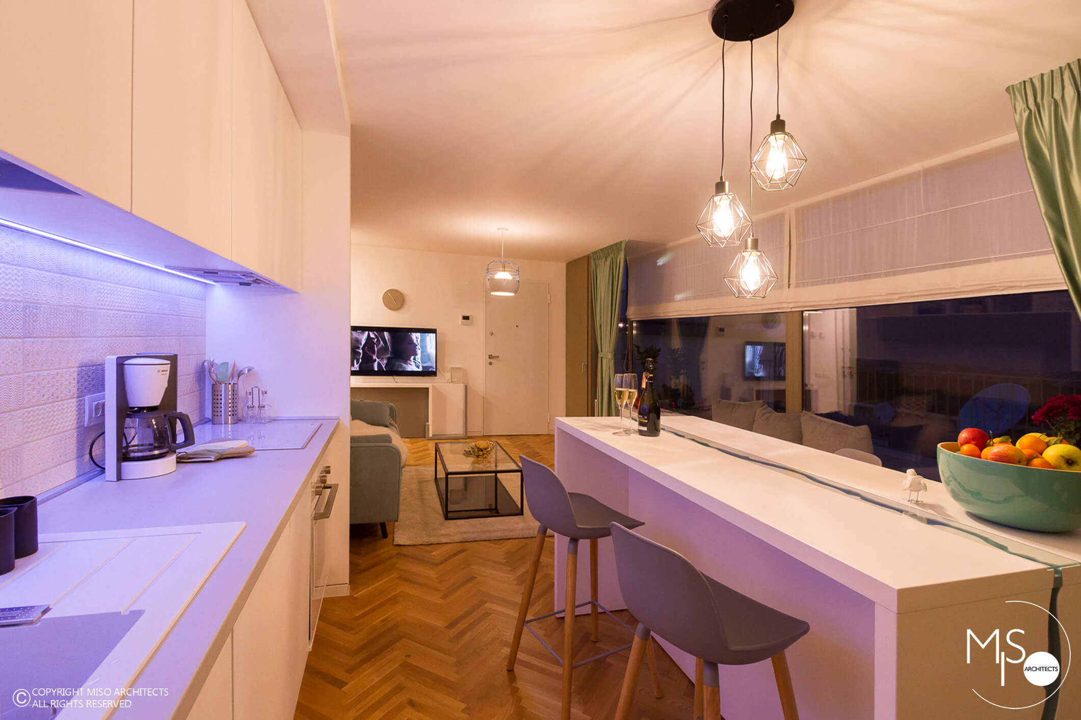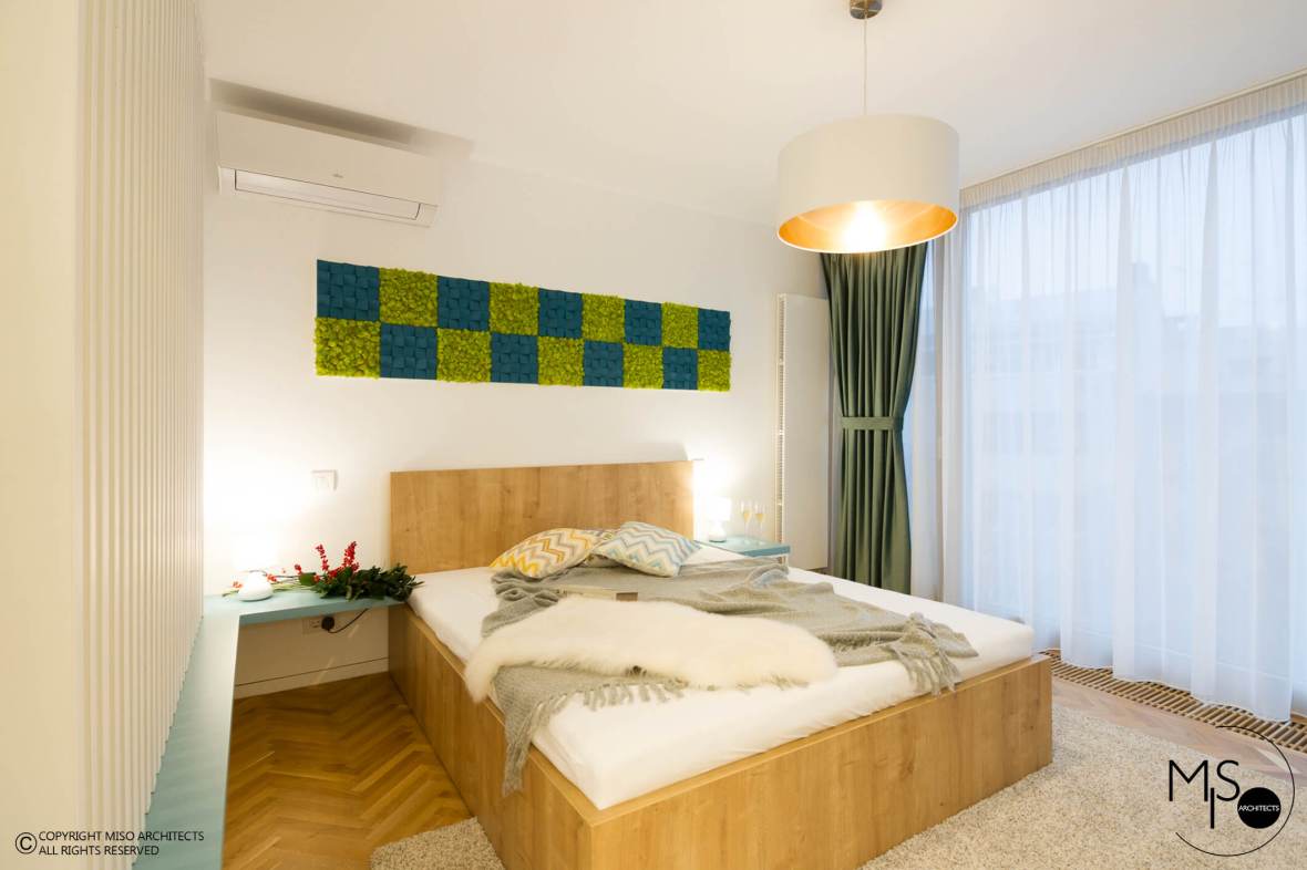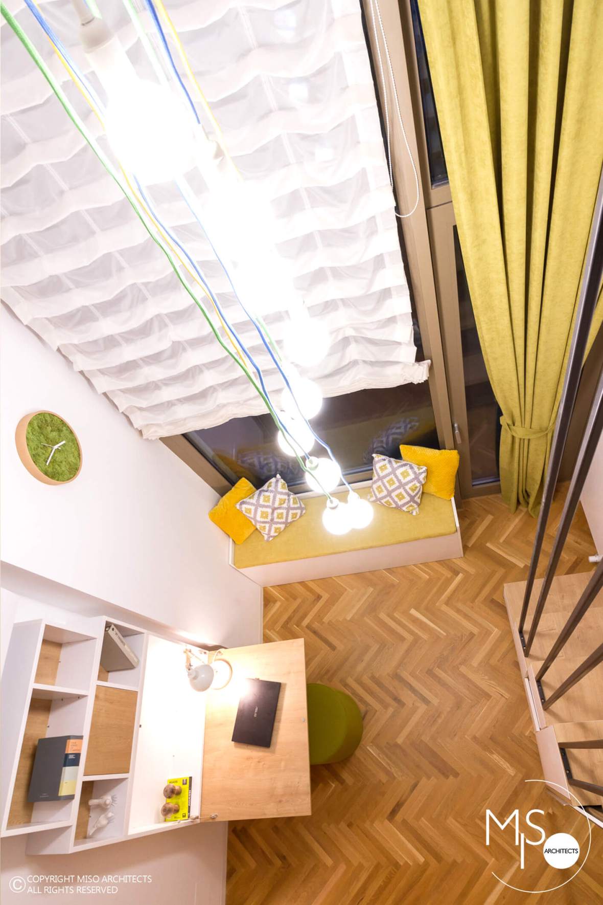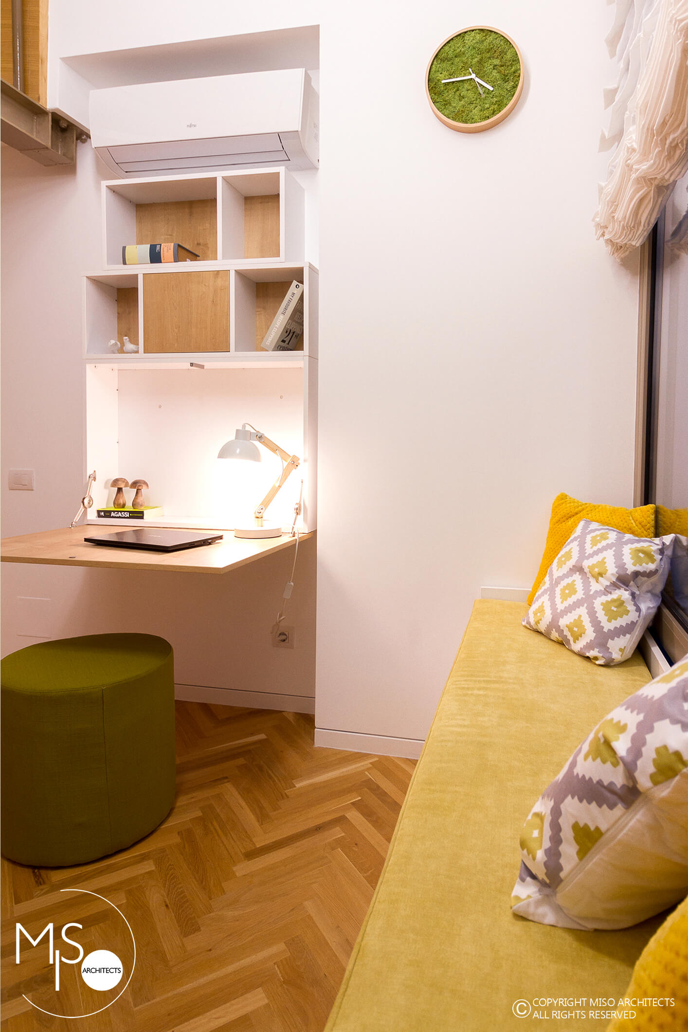 Apartamentul a fost achiziţionat la începutul verii de către proprietarii care nu locuiesc în Bucureşti, cu scopul de a fi închiriat şi folosit ulterior de fiica lor plecată din ţară la momentul de faţă. Câteva aspecte cheie fac acest apartament foarte atractiv atât ca locuinţa cât şi ca investiţie, în primul rând poziţia chiar în centrul oraşului, nivelul ridicat de confort al imobilului şi a finisajelor acestuia, precum şi faptul că accesul în locuință se face nu doar pe scări, dar şi printr-un lift care se deschide direct în apartament cu comanda electronică. De asemenea, un element distinctiv este dormitorul cu platformă suspendată cu înălţimea totală de 4 m, care are un farmec aparte şi este cu totul ieşit din comun pentru un apartament de bloc. Amenajarea a fost realizată de echipa Miso Architects. Mai multe detalii la finalul articolului.
