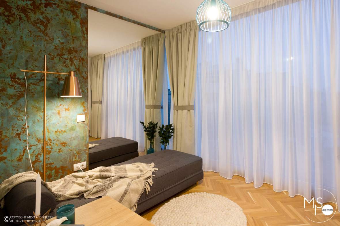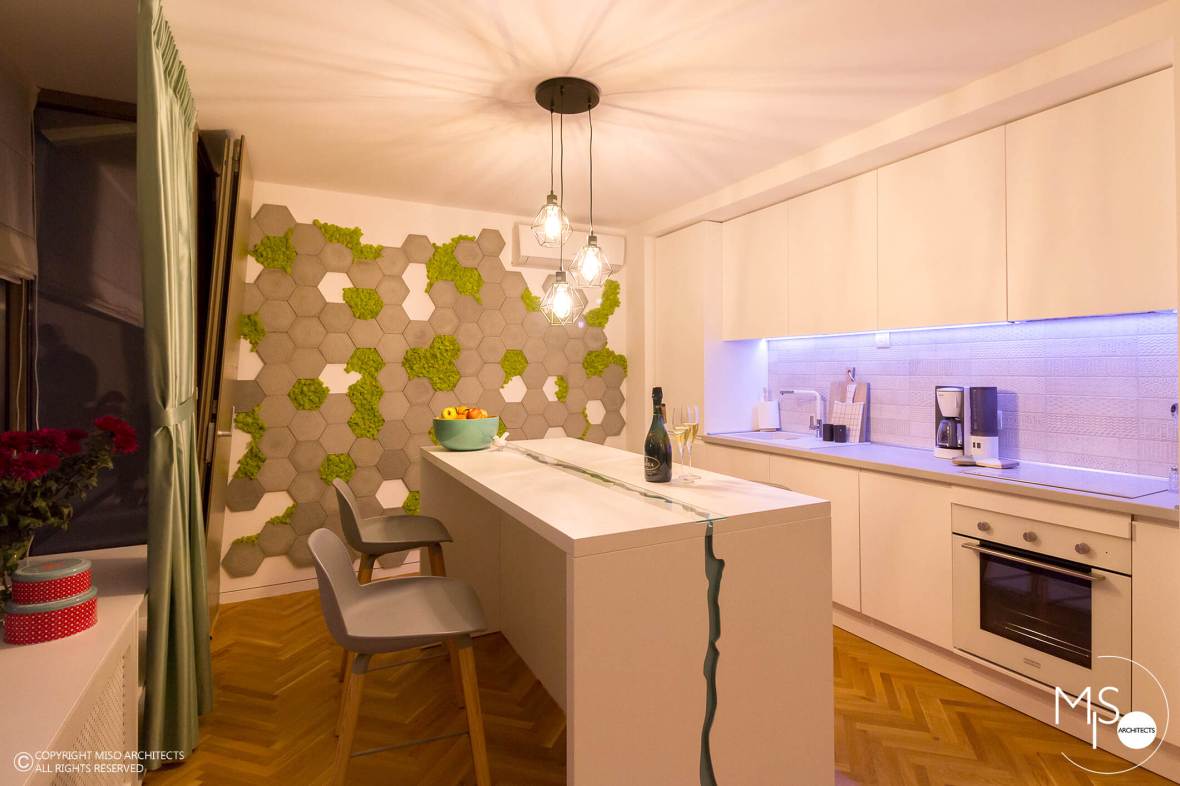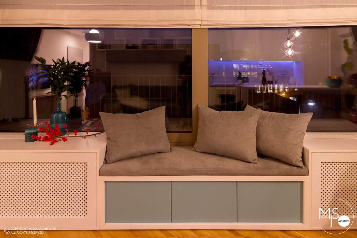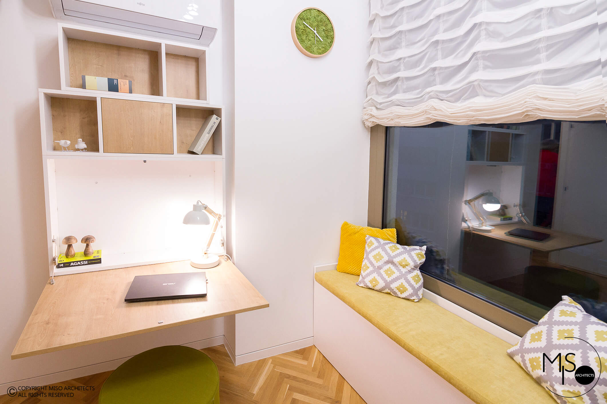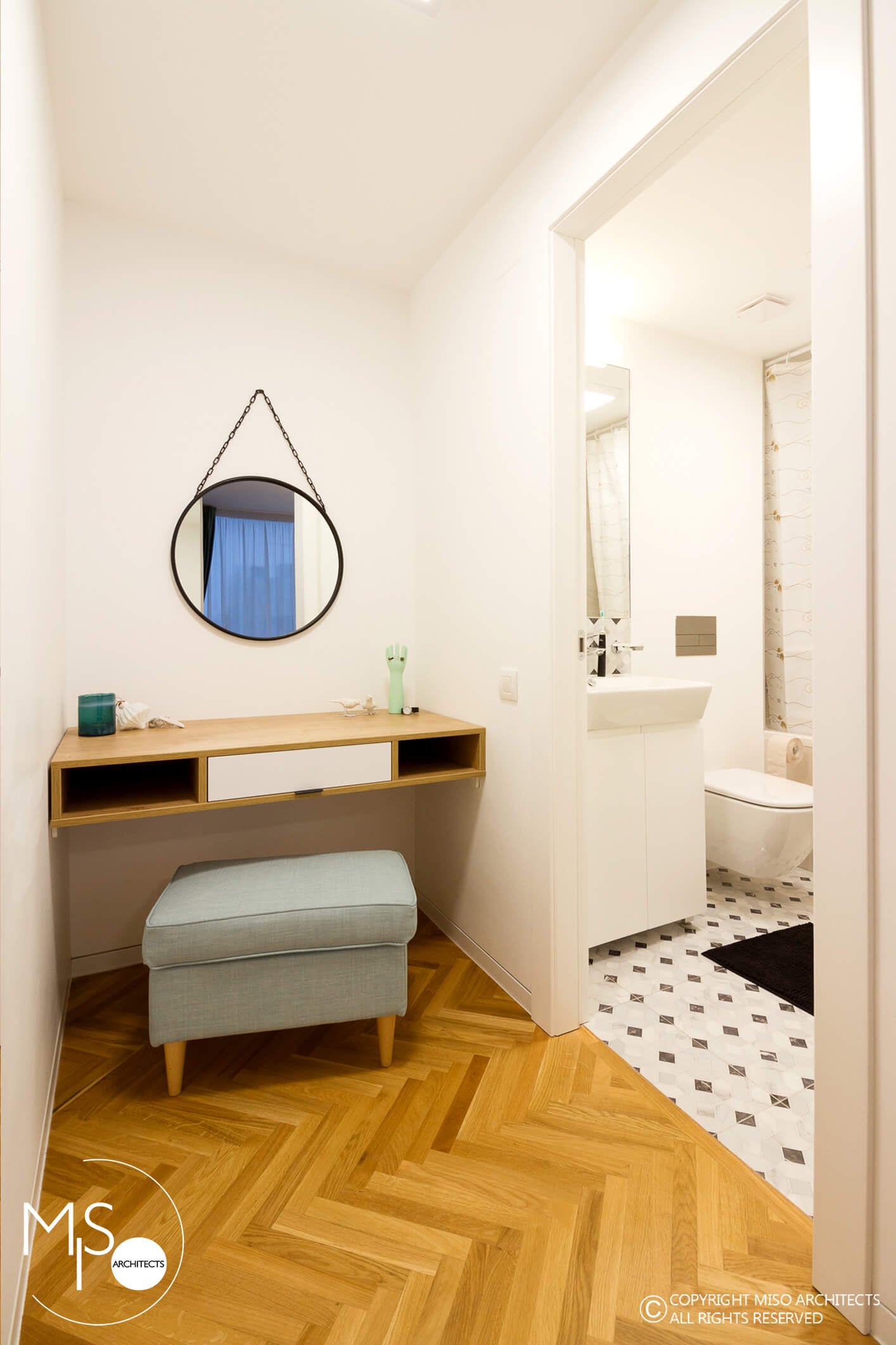 Apartamentul a fost achiziţionat la începutul verii de către proprietarii care nu locuiesc în Bucureşti, cu scopul de a fi închiriat şi folosit ulterior de fiica lor plecată din ţară la momentul de faţă. Câteva aspecte cheie fac acest apartament foarte atractiv atât ca locuinţa cât şi ca investiţie, în primul rând poziţia chiar în centrul oraşului, nivelul ridicat de confort al imobilului şi a finisajelor acestuia, precum şi faptul că accesul în locuință se face nu doar pe scări, dar şi printr-un lift care se deschide direct în apartament cu comanda electronică. De asemenea, un element distinctiv este dormitorul cu platformă suspendată cu înălţimea totală de 4 m, care are un farmec aparte şi este cu totul ieşit din comun pentru un apartament de bloc. Amenajarea a fost realizată de echipa Miso Architects. Mai multe detalii la finalul articolului.