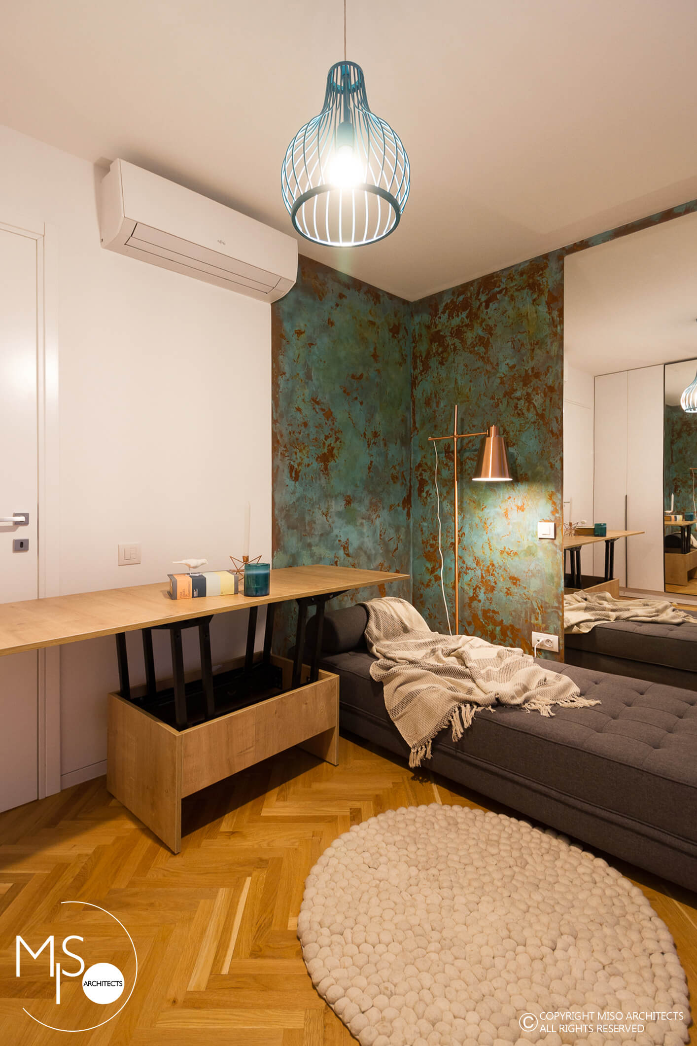 În dormitorul mic am încercat să integrăm într-un spaţiu foarte mic cât mai multe piese multifuncţionale: o canapea extensibilă şi o masă transformabila care poate deveni cu uşurinţă din măsuţa de cafea în birou şi masa de dining în caz de nevoie. Şi aici am găsit loc pentru un dulap de haine, astfel încât şi această cameră să poată fi utilă pentru orice tip de utilizator.