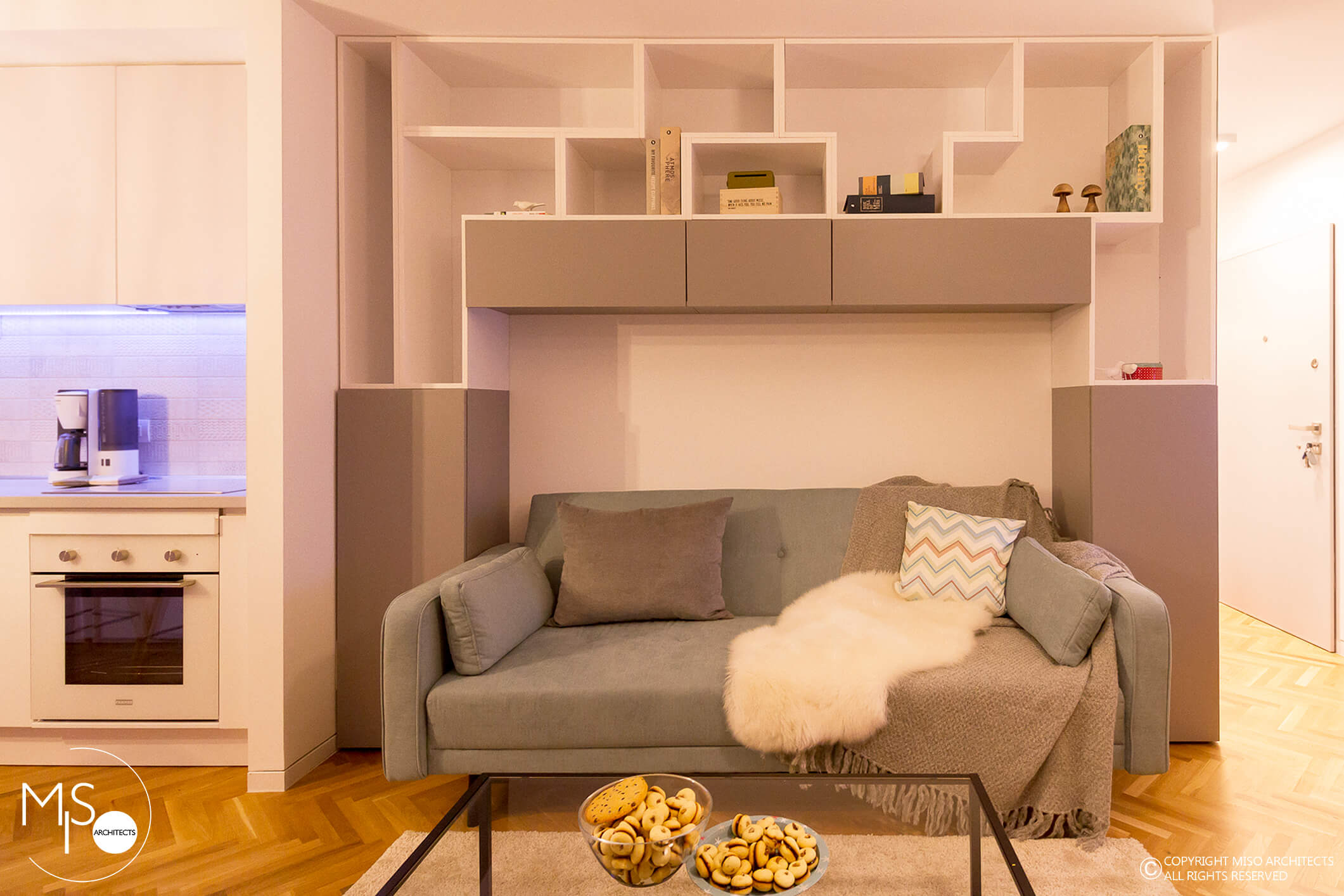 Livingul cu bucătărie deschisă este în acelaşi timp şi camera în care se intra în locuinţă, scopul acesteia fiind să poată găzdui cu succes întreaga familie şi ocupaţiile acestora, chiar dacă este vorba de gătit, uitat la televizor sau stat la discuţii. Astfel am încercat să creăm cât mai multe spaţii care să poată primi toate aceste activităţi şi le-am integrat sub forma unor piese cu design deosebit, aici fiind de menţionat insula de bucătărie cu o “crăpătură” colorată, băncuta cu spaţii de depozitare şi canapeaua extensibilă. Culorile alese sunt deschise astfel încât să dilate spaţiul existent, iar tot în acest sens am încercat să integrăm la nivelul întregului apartament cât mai multe spaţii de depozitare, mai ales că nu există camere special dedicate în acest sens.
