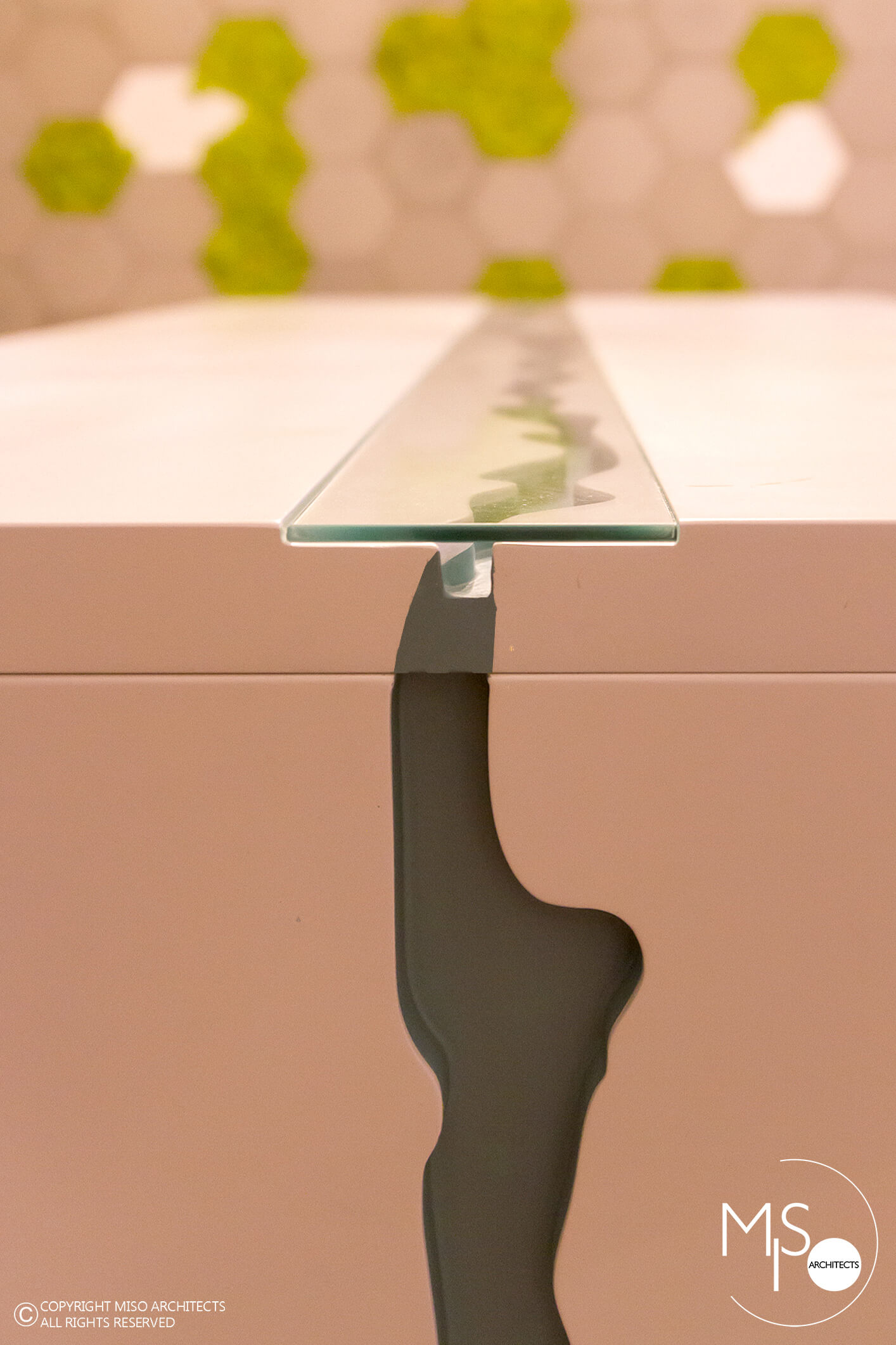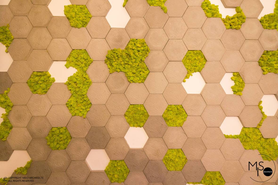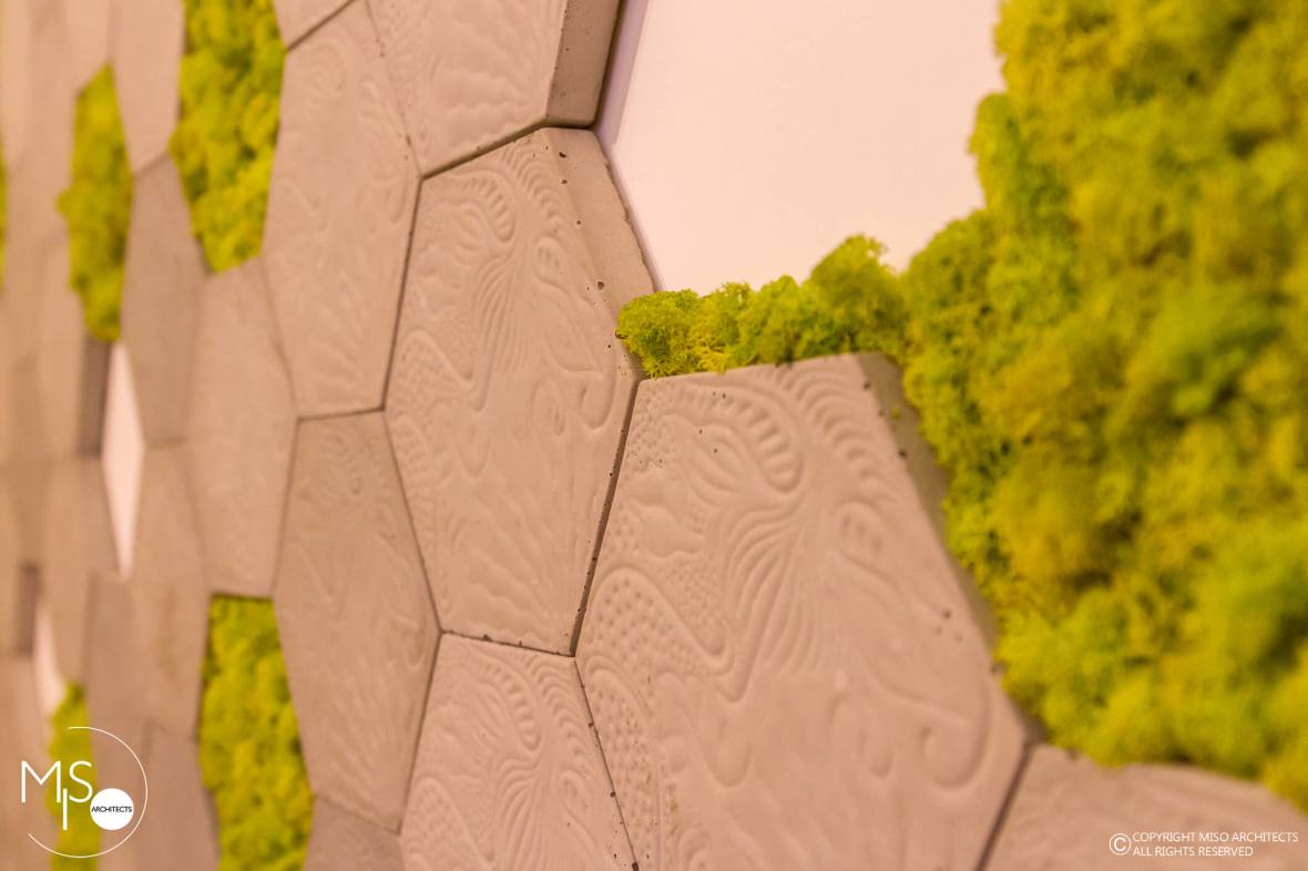 Am utilizat în acest proiect mai multe finisaje deosebite, în frunte cu compoziţia de plăci hexagonale din beton cu inserţii de muşchi, realizată împreună cu Elegance Decor şi amplasată cu succes pe peretele principal din living. Un alt finisaj achiziţionat de la aceeaşi firmă este vopseaua menţionată mai sus, “Patina Rust”, care dă un efect deosebit de culoare şi textura de cupru frumos continuată cu o placă mare de oglindă.