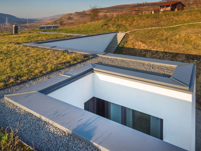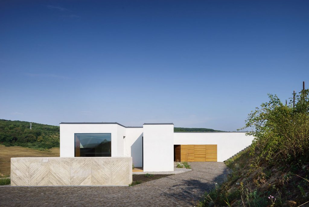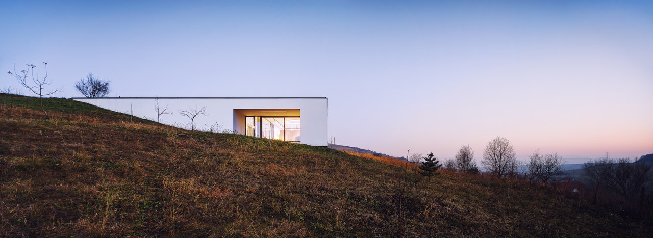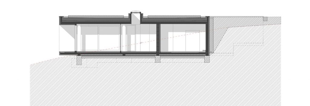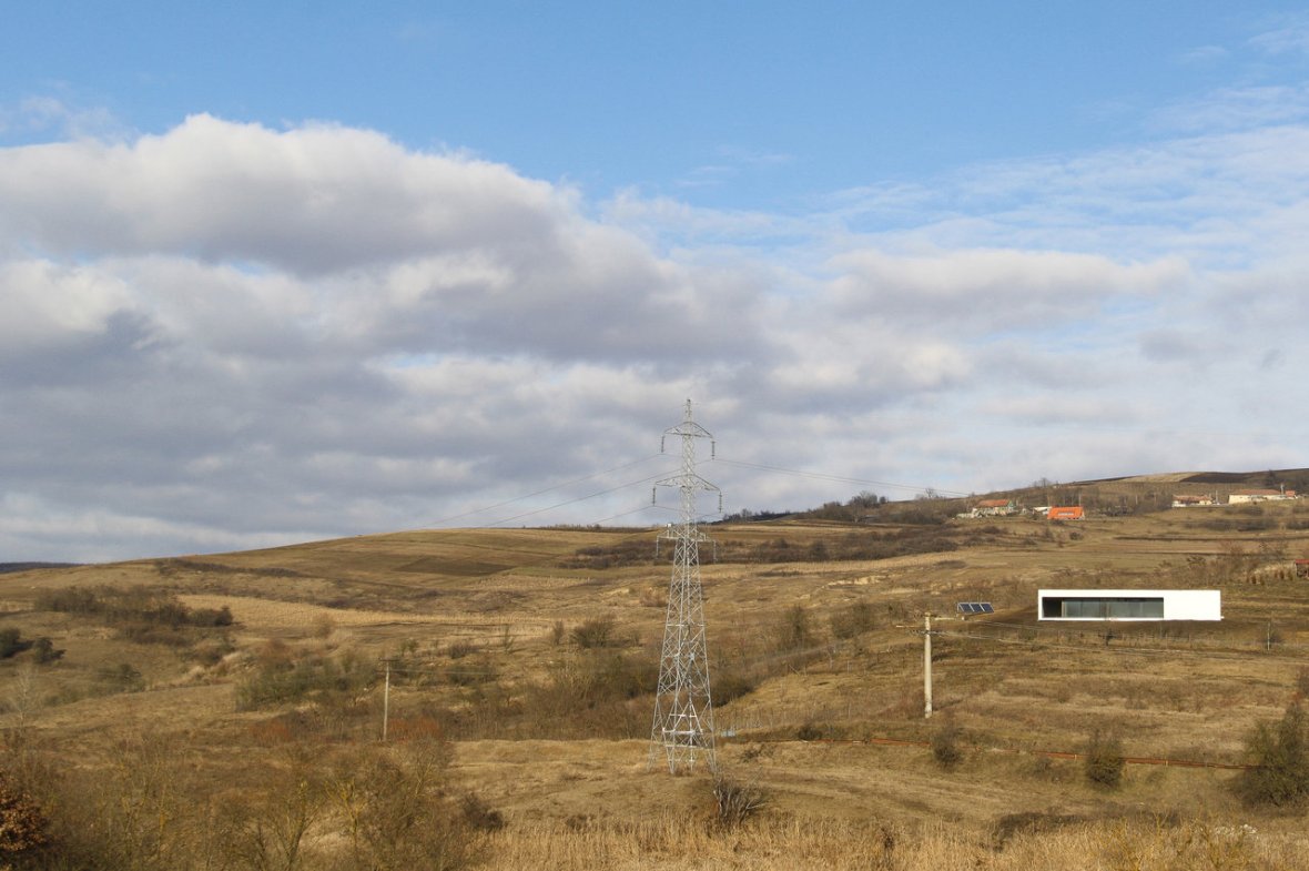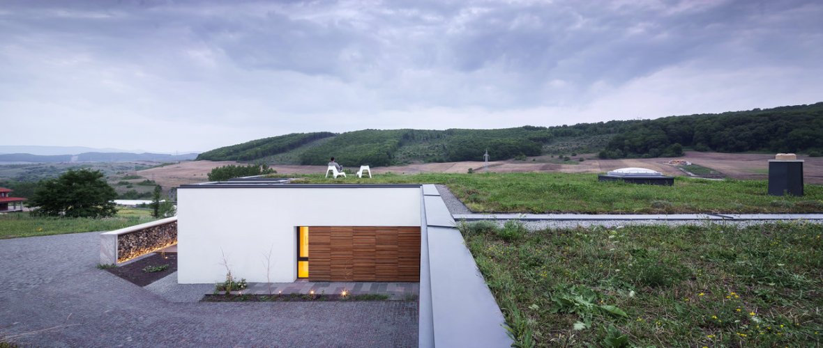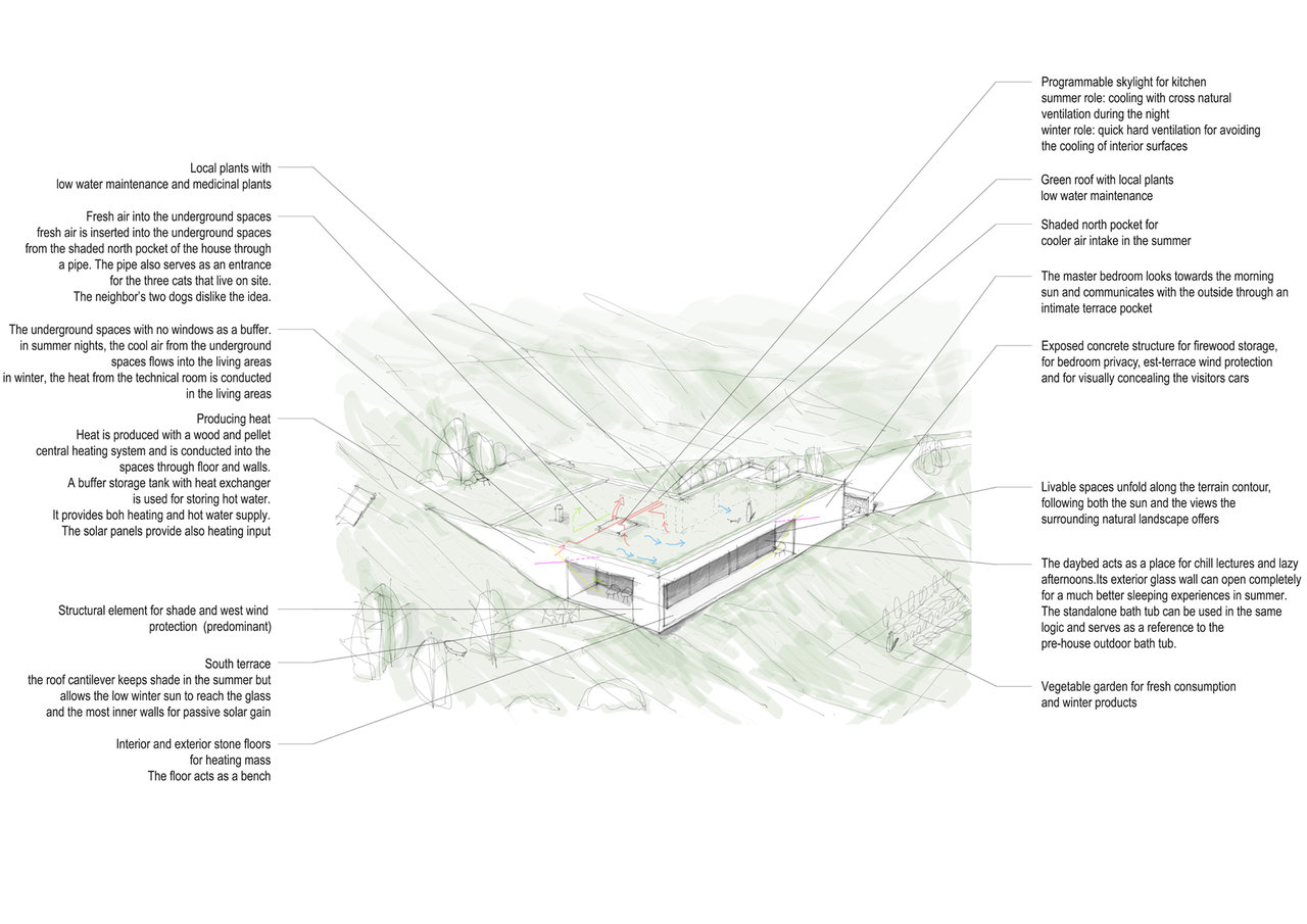 La prima vizită, am gasit o zona deschisă, de observație, un teren în pantă, cu vegetație joasă. La baza unui mic dâmb, o cadă cu plante aromatice, servea ca loc de lectură pentru weekend. Locul privea spre o coamă de pădure. Casa și-a propus să nu disturbe cadrul, să construiască senzația unui obiect peren, care intervine minimal în teren – volumul se naște din deal si se închide printr-o plutire discretă. Casa restituie la nivelul acoperișului suprafața verde pe care a ocupat-o, printr-un acoperiș înierbat, inundat cu specii găsite pe teren.