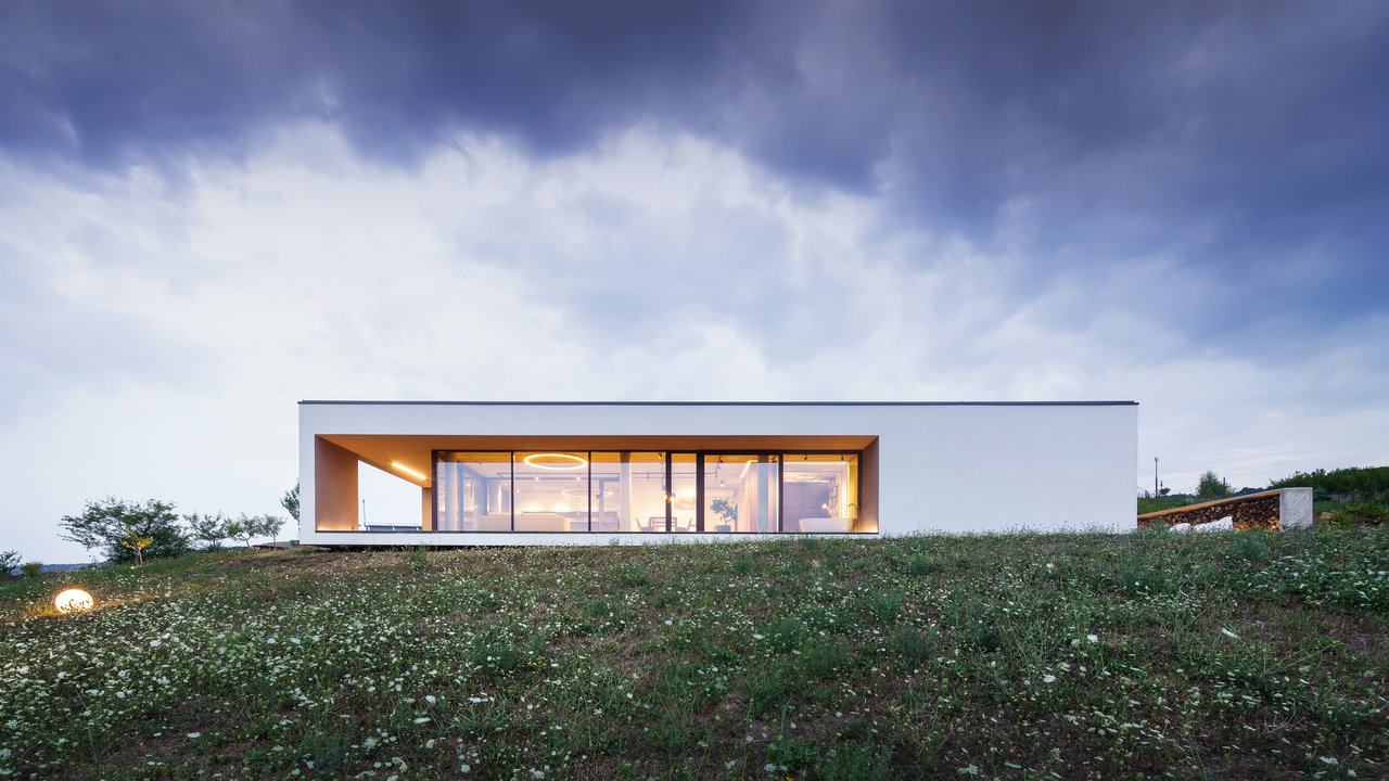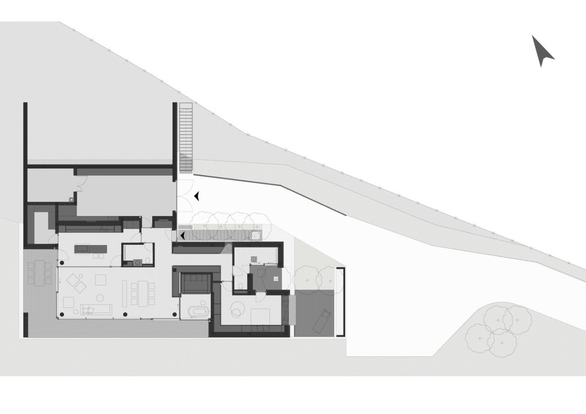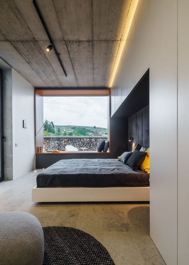 Casa se desfășoară pe un nivel, fiind compusă din două zone funcţionale. Spațiile tehnice și complementare se așează în zonele îngropate. Spațiile locuibile urmăresc curbele de nivel, traseul soarelui și peisajul. Dormitorul principal privește soarele de dimineață și comunică cu terenul printr-o terasă buzunar, intimă. Deschis complet, acesta dialoghează cu dealurile estice, având ca bază vizuală un parapet exterior din beton, care caută să protejeze, prin poziționare și prin funcțiune. Tot în terasa-buzunar, se deschide și baia principală. Pereții acesteia glisează complet vara, dând senzația unui băi dezinhibate, libere, în natură.