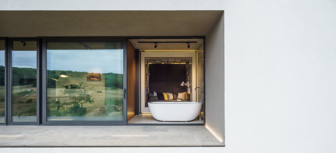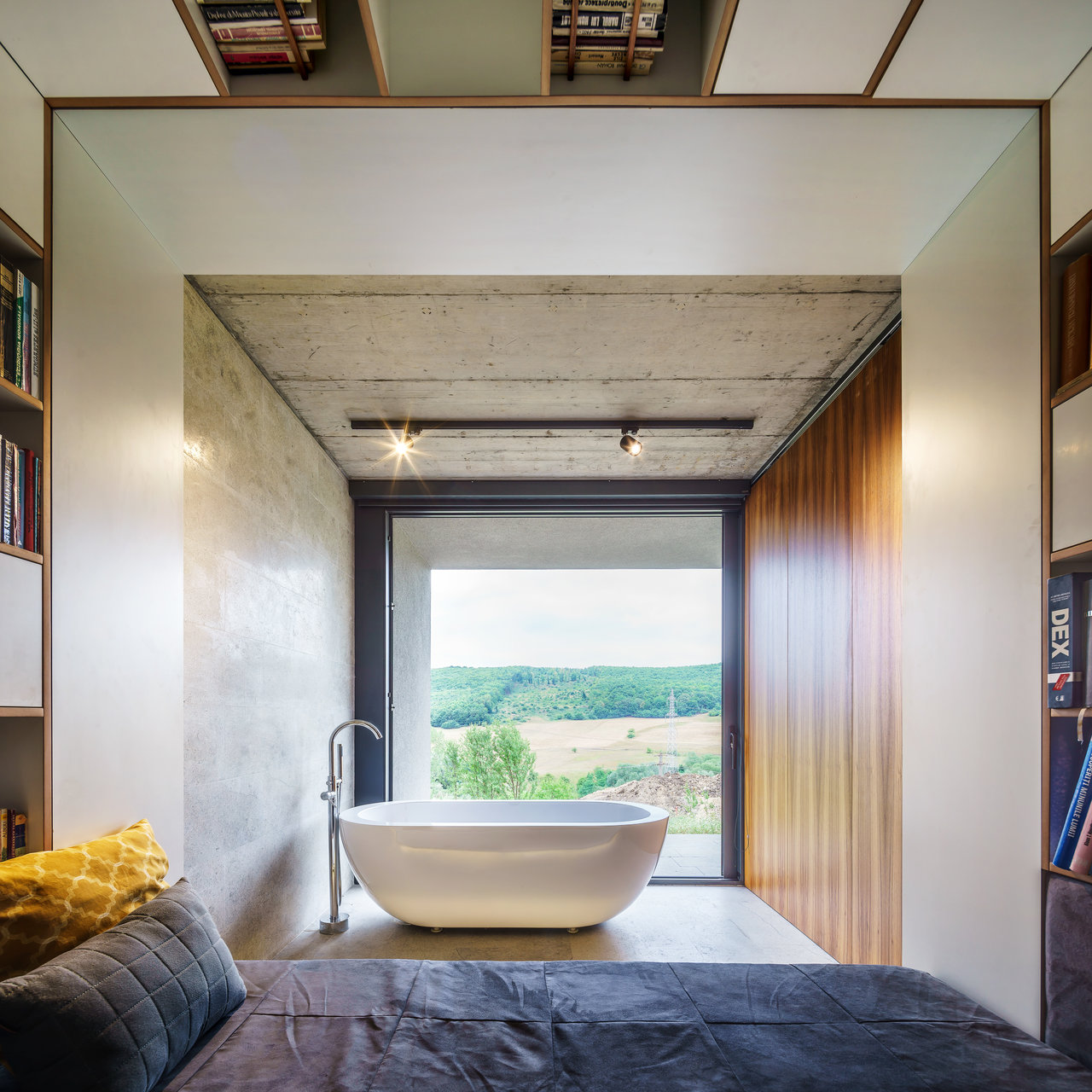 Spațiile de zi se distribuie spre sud, spre pădure. În cadrul acestora, zona de lucru se sustrage vederii. În spatele biroului, într-un buzunar, se naște un spațiu de relaxare, biblioteca-pat de zi, care permite cuplului să se cufunde în lectură. Peretele exterior se deschide complet, transformând spațiul intr-o entitate proprie. Cada realizează o trimitere subtilă la cada exterioară, punctul de început și de naștere a ideii de casă.