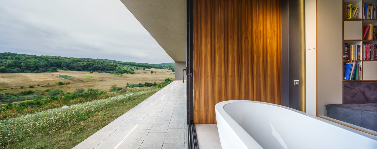 Bucătăria , zona de zi se desfac către peisaj, mizând pe o transparență desăvârșită. O terasă acoperită învăluie spațiile de zi, preluând secvențial caracterul acestora. Senzația interioară rămâne cea inițială, de punct de observatie. Pe prelungirea acoperișului casei, la baza unui mic damb, se aşează cada de pe teren, în poziția inițială; băile în natură, vor continua, terenul în pantă, natural, acoperit de vegetație joasă.