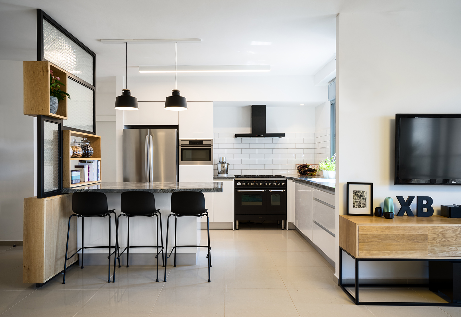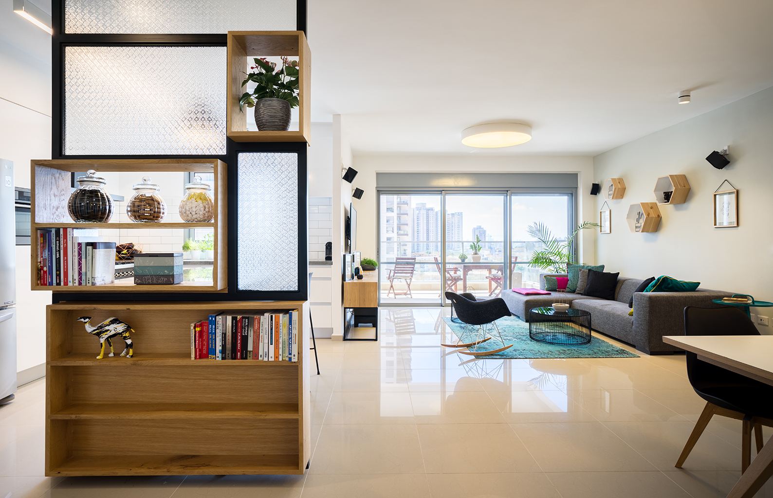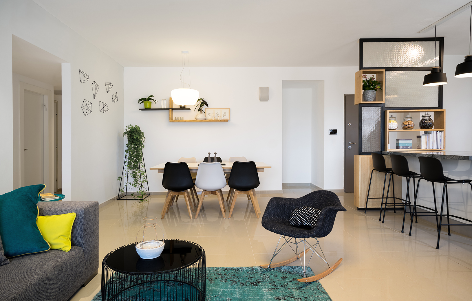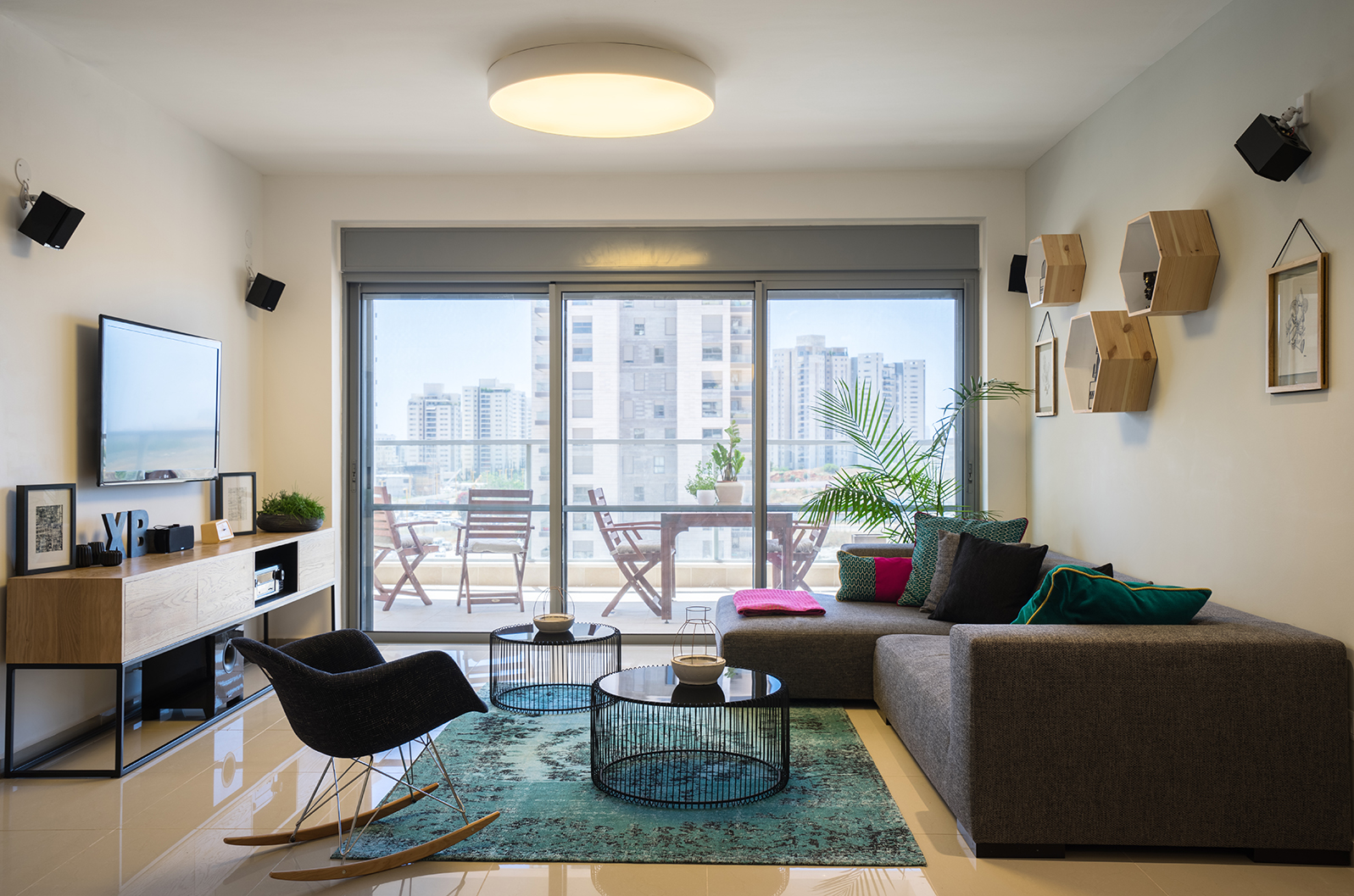 Acest apartament cu 5 camere din Israel a fost amenajat de designerii Eran Naim si Ori Donitz de la studioul En Design Studio. Apartamentul se afla intr-un bloc nou construit, la etajul 21. Apartamentul se recomanda prin atmosfera tinereasca a amenajarii. Principalele elemente care creeaza jocul spatiului sunt nuantele de alb si gri cu elementele de lemn ale mobilierului. Dinamica a fost redata prin detaliile si nuantele mobilierului. Bucataria a fost realizata in alb si negru pentru a aduce elenganta in combinatia cu suprafetele de inox. Dormitorul a fost conceput tot pe baza accentelor. Aici, rolul principal il are peretele vopsit in albastru pal care a devenit un fond pentru patul din material textil de culoare alba. In camera copiilor, un perete a fost finisat ca fiind o tabla de scris cu creta – un element care aduce buna dispozitie in viata copiilor, dar si opreste grijile parintilor in privinta riscului de a avea toti peretii pictati.