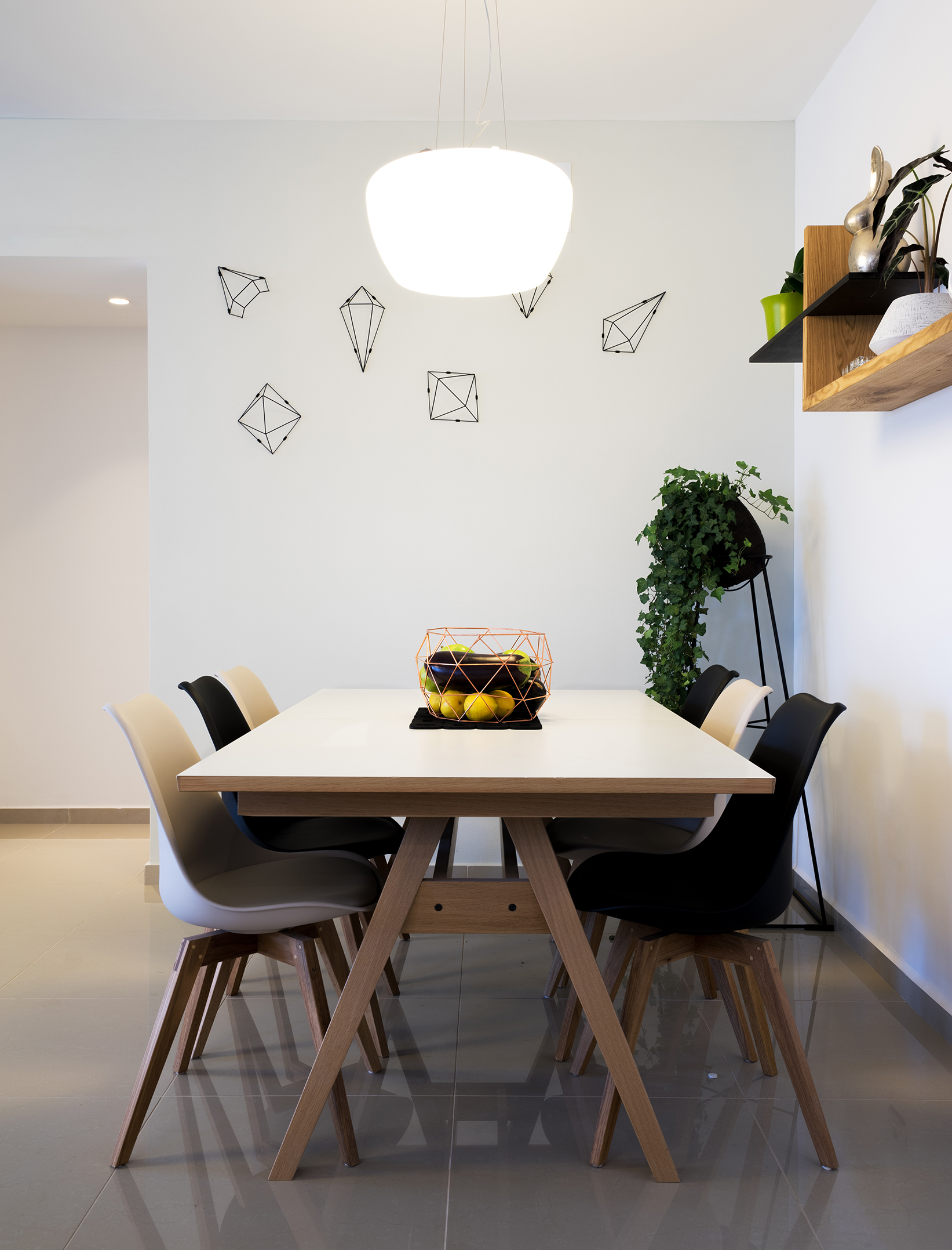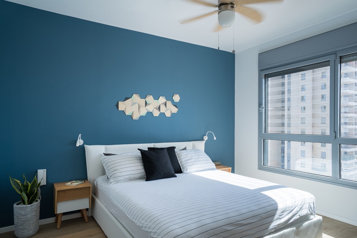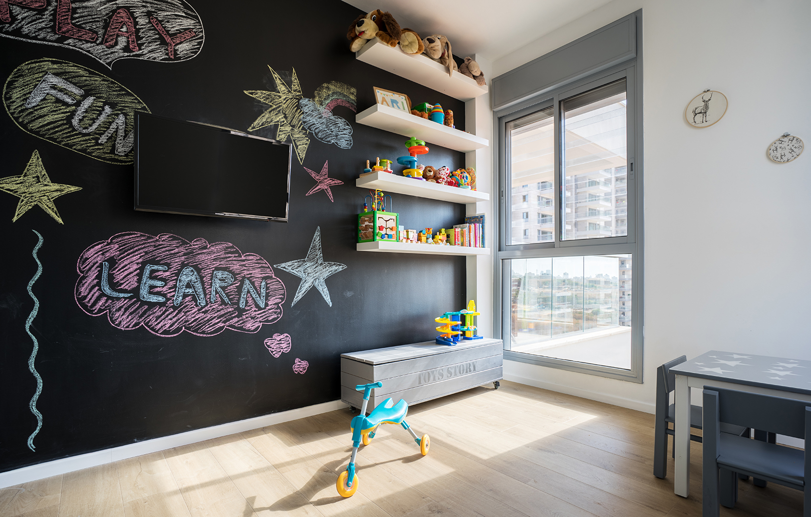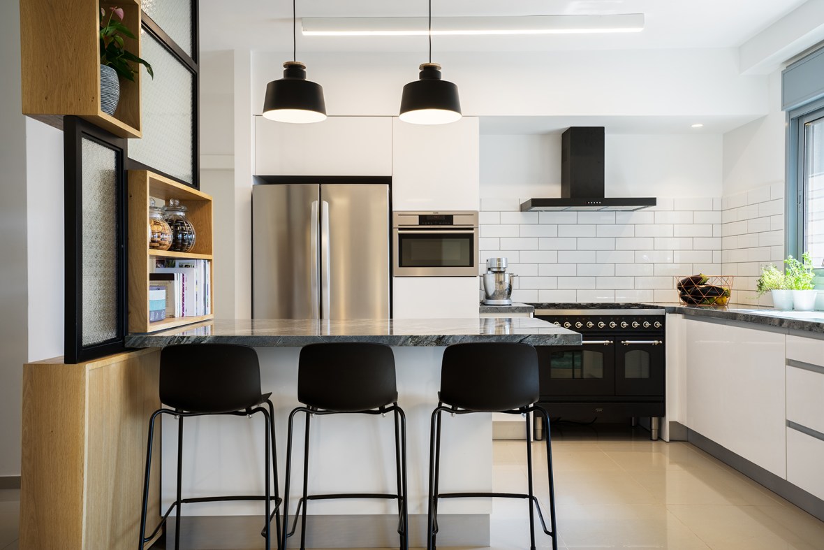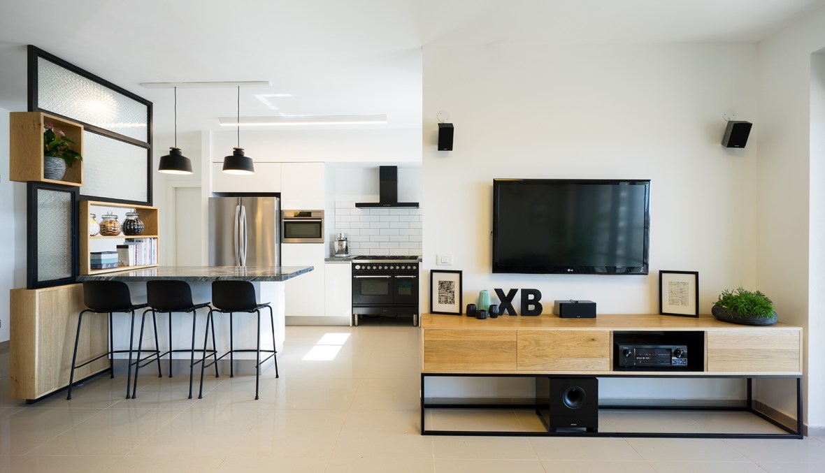 Acest apartament cu 5 camere din Israel a fost amenajat de designerii Eran Naim si Ori Donitz de la studioul En Design Studio. Apartamentul se afla intr-un bloc nou construit, la etajul 21. Apartamentul se recomanda prin atmosfera tinereasca a amenajarii. Principalele elemente care creeaza jocul spatiului sunt nuantele de alb si gri cu elementele de lemn ale mobilierului. Dinamica a fost redata prin detaliile si nuantele mobilierului. Bucataria a fost realizata in alb si negru pentru a aduce elenganta in combinatia cu suprafetele de inox. Dormitorul a fost conceput tot pe baza accentelor. Aici, rolul principal il are peretele vopsit in albastru pal care a devenit un fond pentru patul din material textil de culoare alba. In camera copiilor, un perete a fost finisat ca fiind o tabla de scris cu creta – un element care aduce buna dispozitie in viata copiilor, dar si opreste grijile parintilor in privinta riscului de a avea toti peretii pictati.