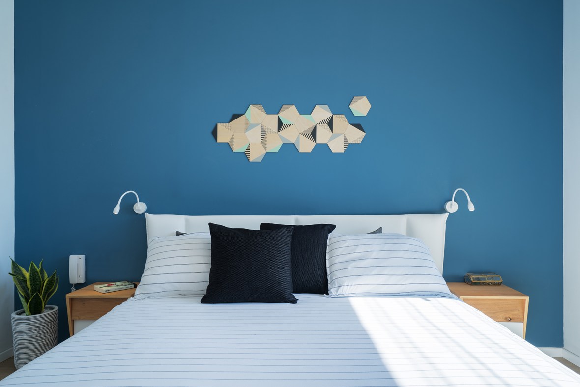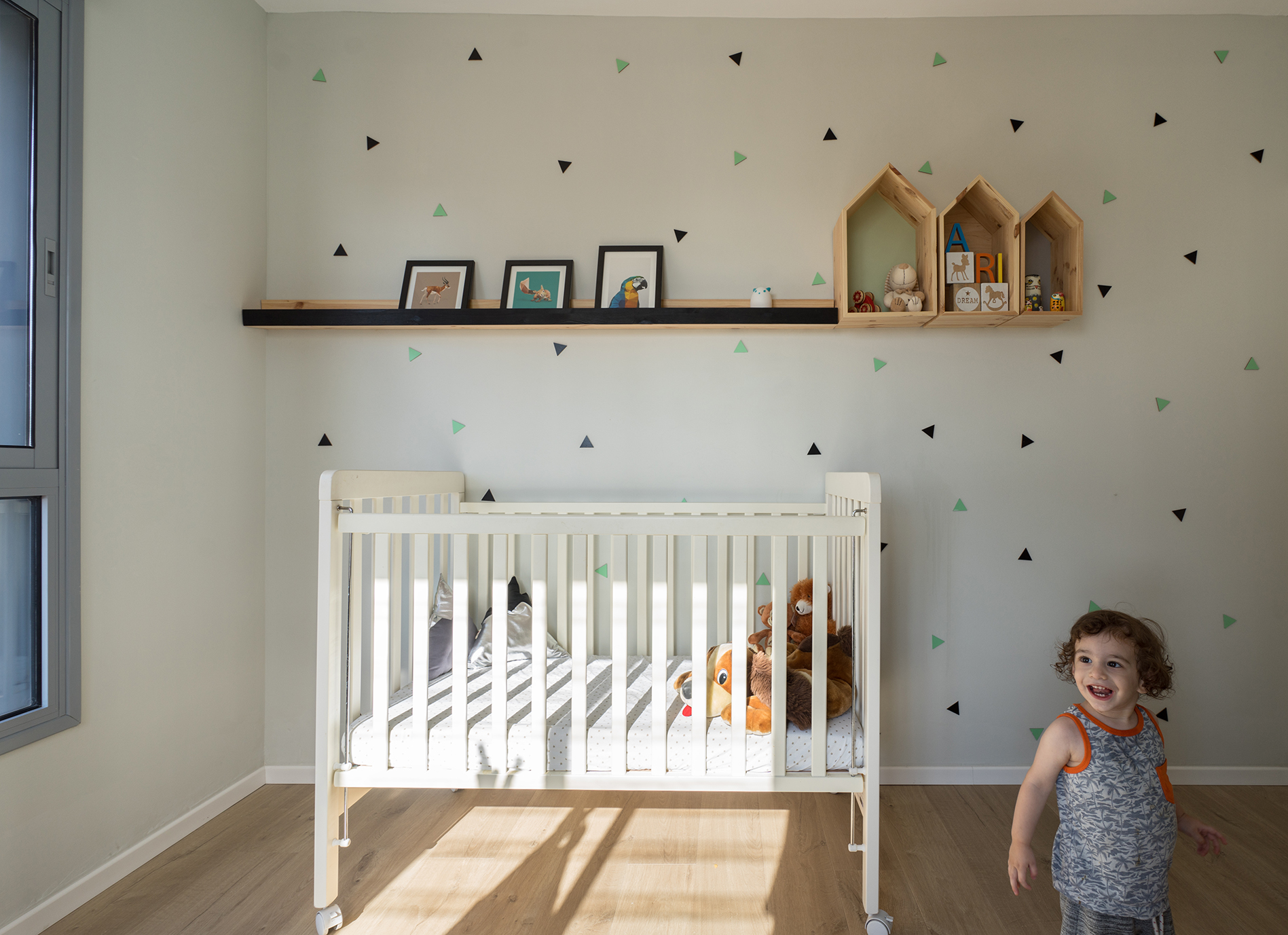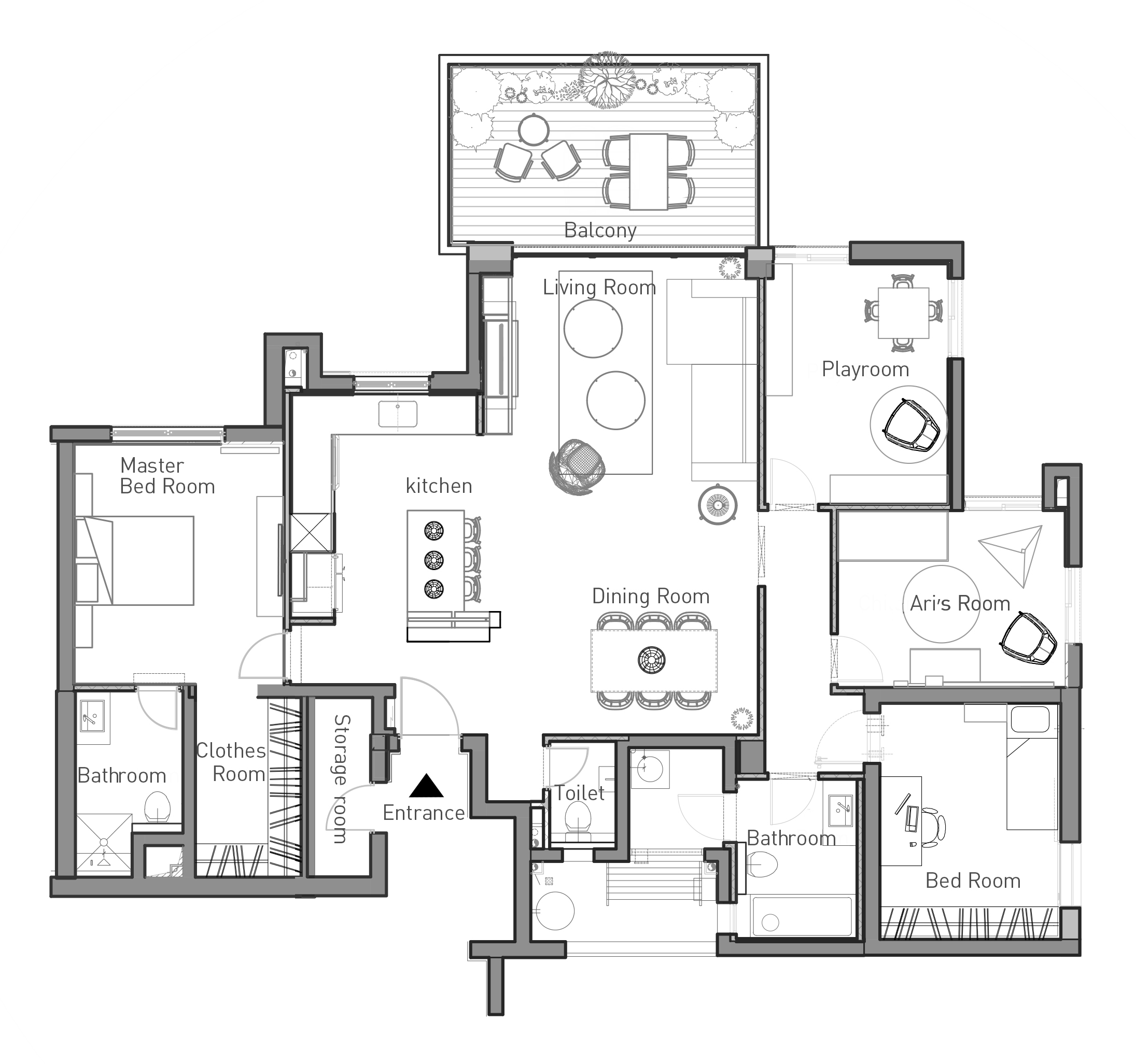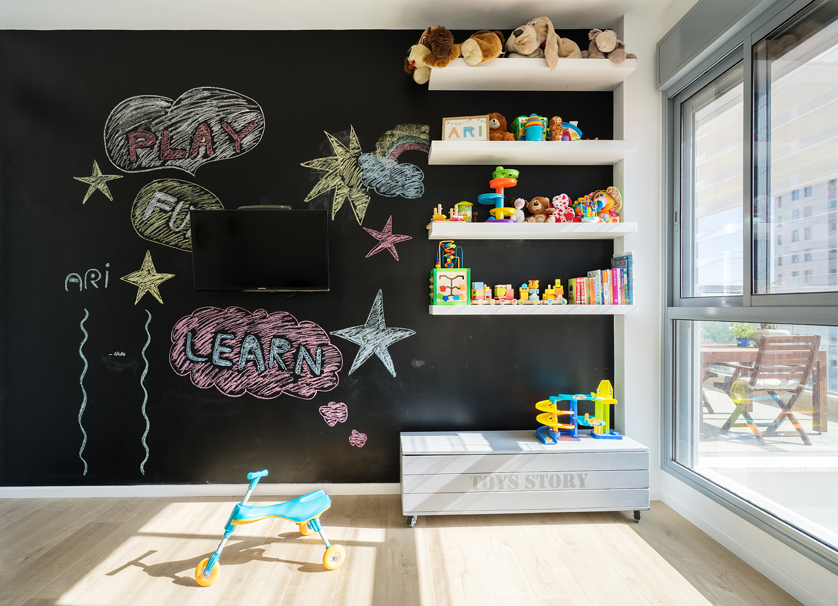 Acest apartament cu 5 camere din Israel a fost amenajat de designerii Eran Naim si Ori Donitz de la studioul En Design Studio. Apartamentul se afla intr-un bloc nou construit, la etajul 21. Apartamentul se recomanda prin atmosfera tinereasca a amenajarii. Principalele elemente care creeaza jocul spatiului sunt nuantele de alb si gri cu elementele de lemn ale mobilierului. Dinamica a fost redata prin detaliile si nuantele mobilierului. Bucataria a fost realizata in alb si negru pentru a aduce elenganta in combinatia cu suprafetele de inox. Dormitorul a fost conceput tot pe baza accentelor. Aici, rolul principal il are peretele vopsit in albastru pal care a devenit un fond pentru patul din material textil de culoare alba. In camera copiilor, un perete a fost finisat ca fiind o tabla de scris cu creta – un element care aduce buna dispozitie in viata copiilor, dar si opreste grijile parintilor in privinta riscului de a avea toti peretii pictati.