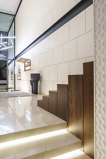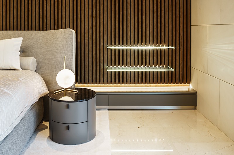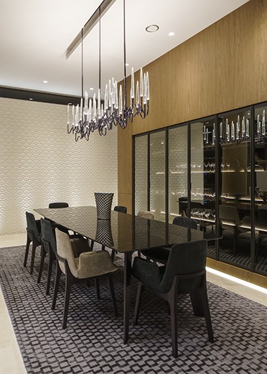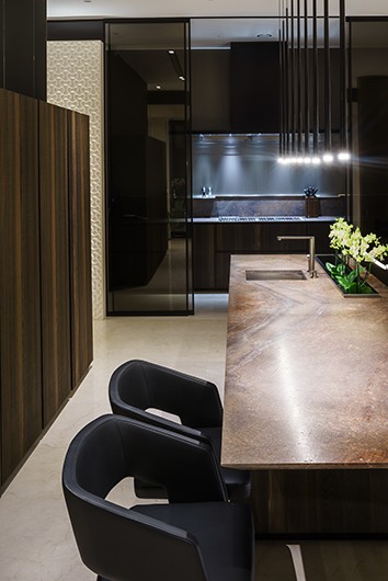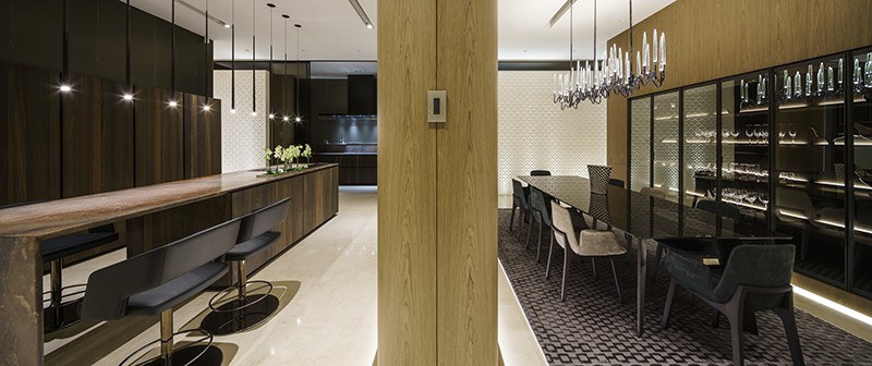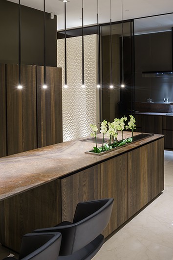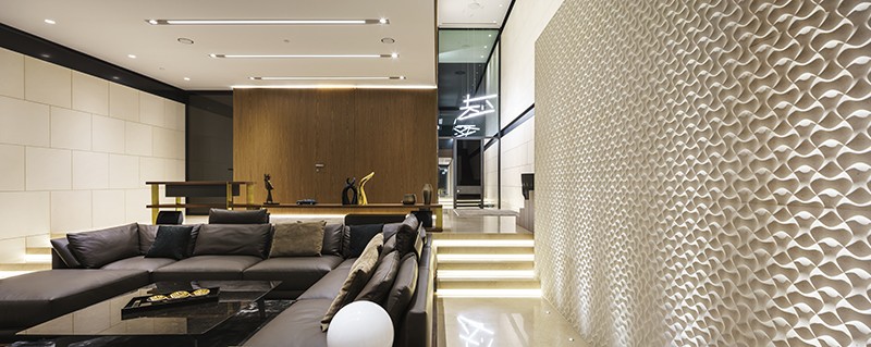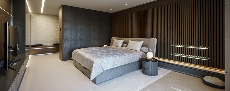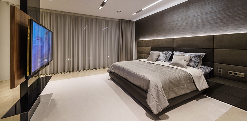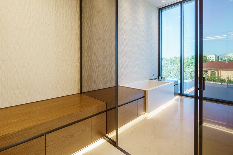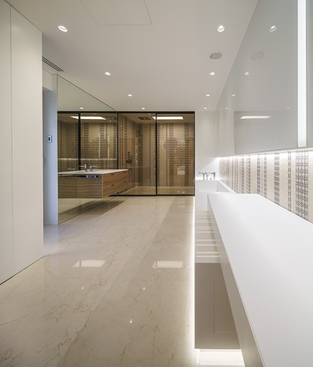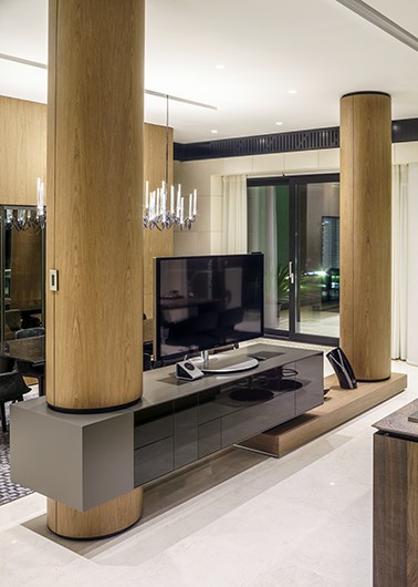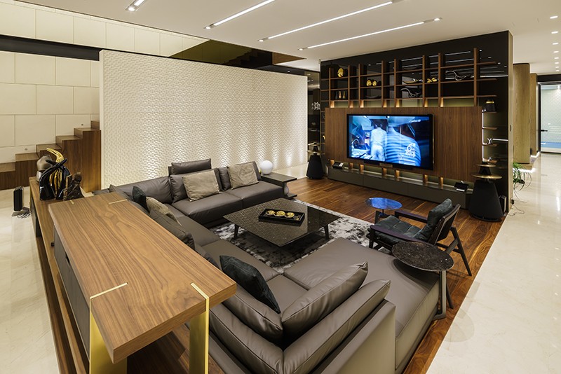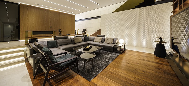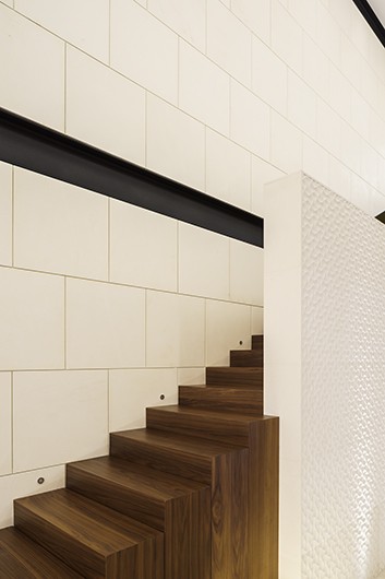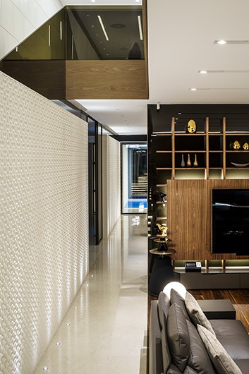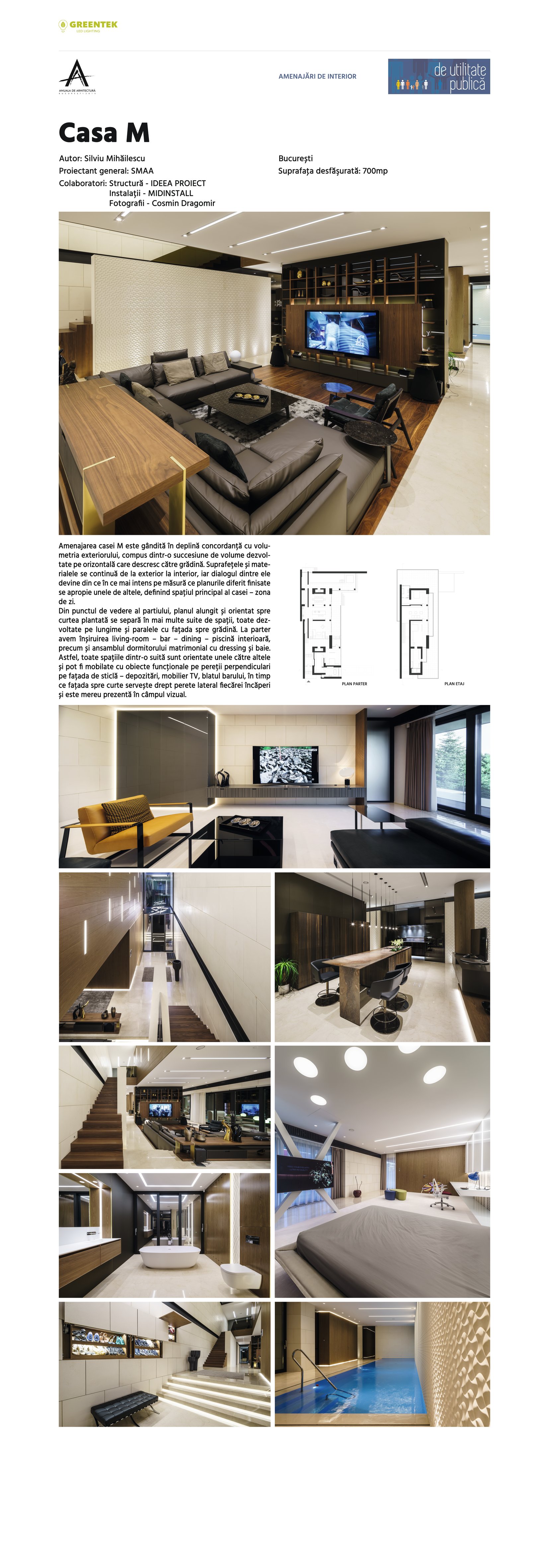 Amenajarea casei M a fost realizata de Silviu Mihailescu si este gândită în deplină concordanță cu volumetria exteriorului, compus dintr-o succesiune de volume dezvoltate pe orizontală, care descresc către grădină. Suprafețele și materialele se continuă de la exterior la interior, iar dialogul dintre ele devine din ce în ce mai intens pe măsură ce planurile diferit finisate se apropie unele de altele, definind spațiul principal al casei – zona de zi. Din punctul de vedere al partiului, planul alungit și orientat spre curtea plantată se separă în mai multe suite de spații, toate dezvoltate pe lungime și paralele cu fațada spre grădină. Stâlpii rotunzi ai casei nu concurează orizontalitatea dominantă, se retrag întotdeauna față de muchiile subțiri ale plăcilor și față de compartimentările dintre camere și sunt percepuți mai mult ca elemente de amenajare decât ca prezențe structurale. O altă caracteristică a spațiului interior este compoziția volumelor virtuale, alungite, care cuprind spațiile, atât pe orizontală cât și pe verticală. Repetând tridimensional jocul suitelor de camere care se poate cu ușurință deduce din plan, relațiile dintre spații câștigă individualitate prin amplasarea la cote diferite pe verticală.
