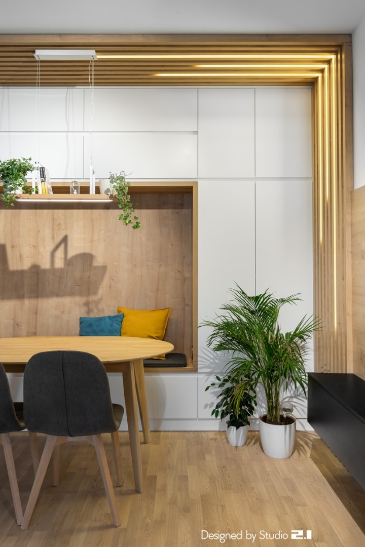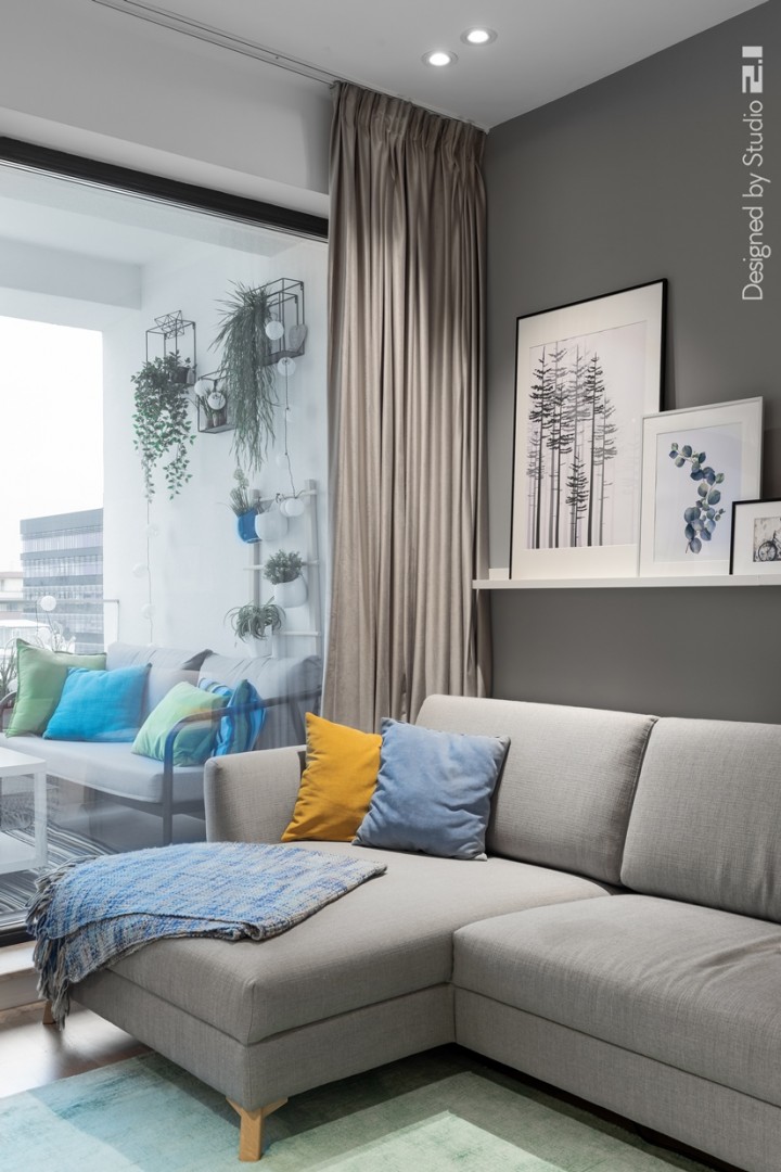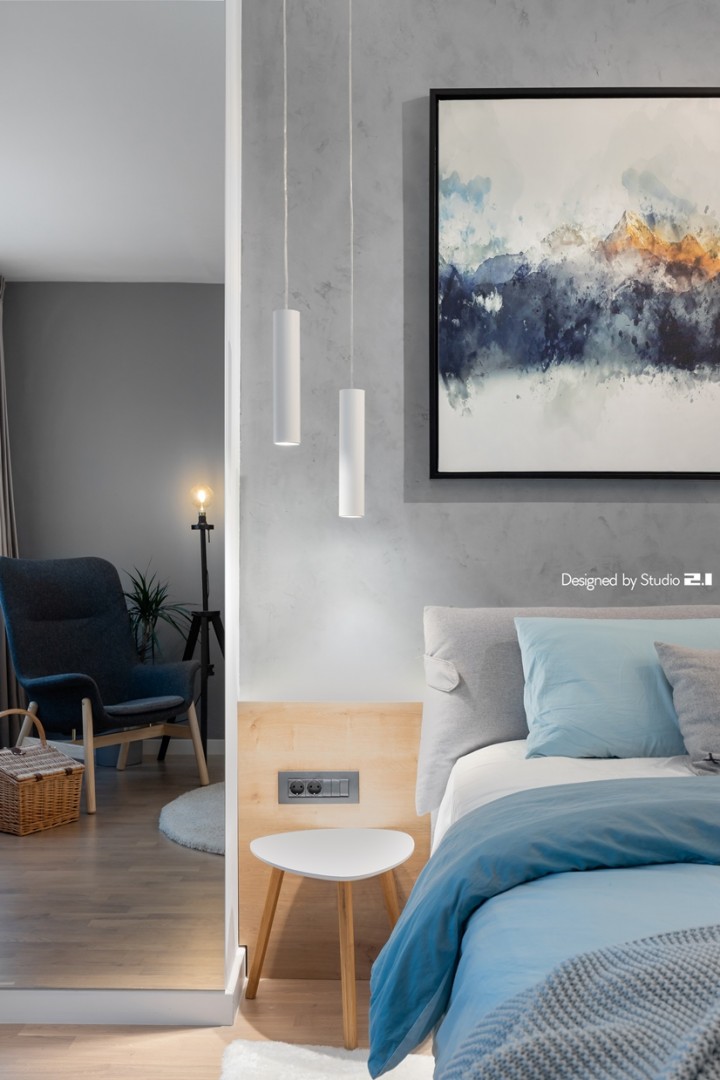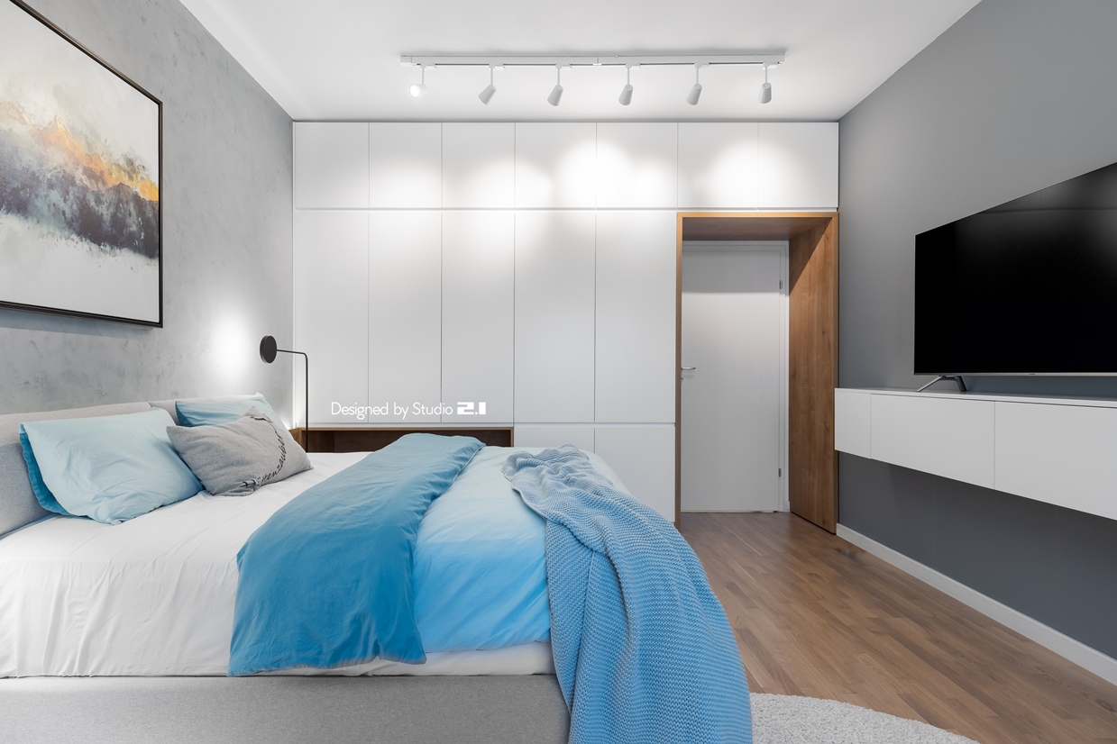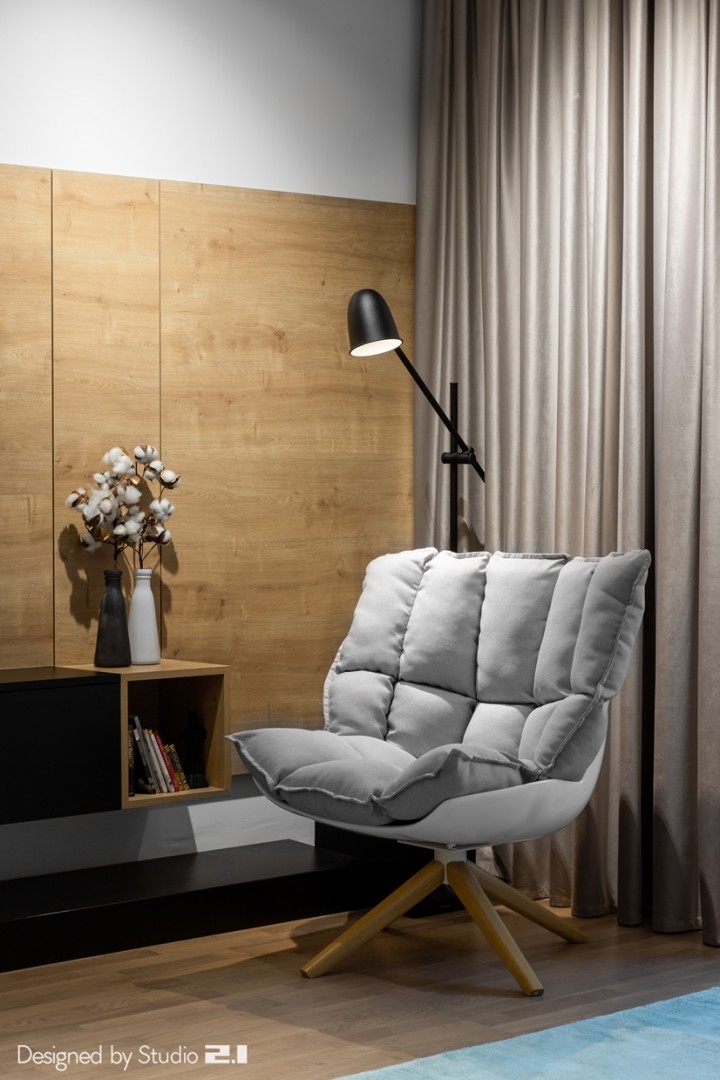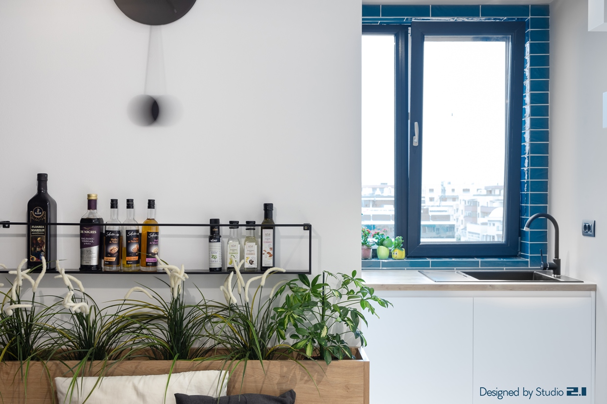Proiectul a fost realizat de Studio 2.1 si a constat în amenajarea unui apartament cu două camere pentru un beneficiar tânăr, care și-a dorit ca noua sa locuință să fie primitoare, cu elemente customizate care să îl reprezinte. Pentru acest proiect focusul principal a fost utilizarea cât mai funcțională a spațiului disponibil, crearea unor zone de depozitare generoase, păstrând în același timp fluiditatea circulațiilor. Pornind de la un design cu linii geometrice simple, presărat cu câteva compoziții asimetrice de obiecte, propunerea noastră are un aer retro, cu elemente ce dau personalitate spațiului și acel sentiment de “cozy”. Culoarea-accent ce o regăsim în fiecare spațiu este albastru/turcuaz, ducând ușor cu gândul la o casă de vacanță.