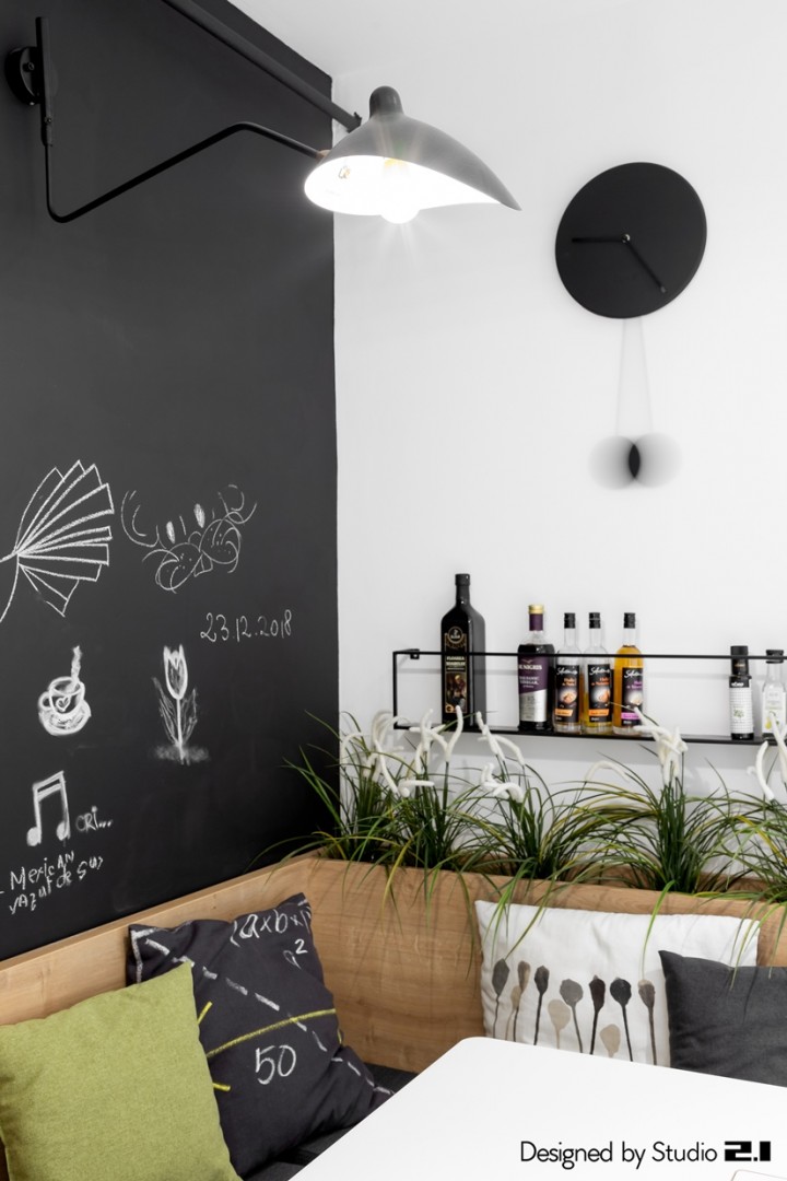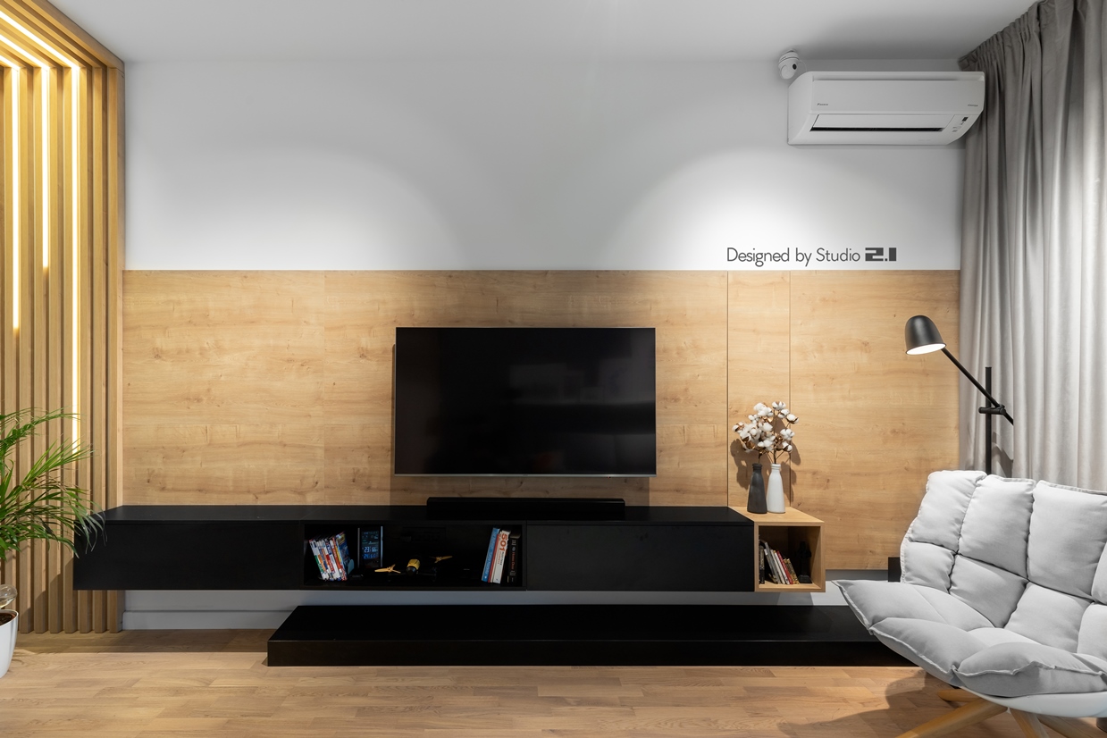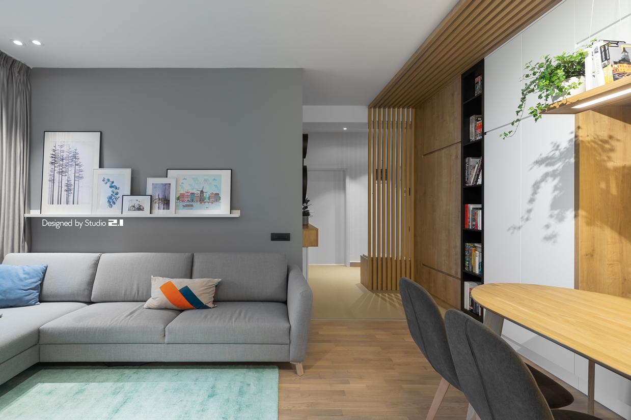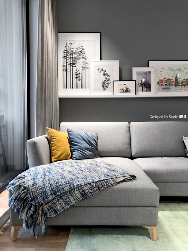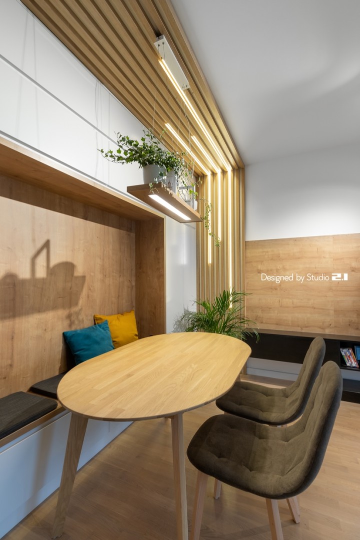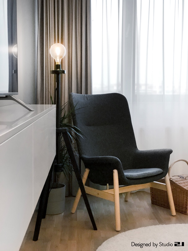 Proiectul a fost realizat de Studio 2.1 si a constat în amenajarea unui apartament cu două camere pentru un beneficiar tânăr, care și-a dorit ca noua sa locuință să fie primitoare, cu elemente customizate care să îl reprezinte. Pentru acest proiect focusul principal a fost utilizarea cât mai funcțională a spațiului disponibil, crearea unor zone de depozitare generoase, păstrând în același timp fluiditatea circulațiilor. Pornind de la un design cu linii geometrice simple, presărat cu câteva compoziții asimetrice de obiecte, propunerea noastră are un aer retro, cu elemente ce dau personalitate spațiului și acel sentiment de “cozy”. Culoarea-accent ce o regăsim în fiecare spațiu este albastru/turcuaz, ducând ușor cu gândul la o casă de vacanță.