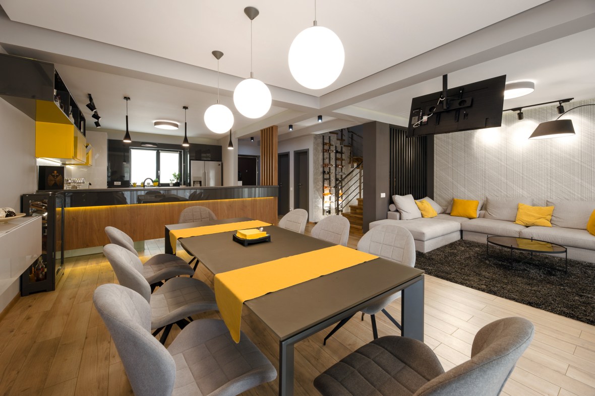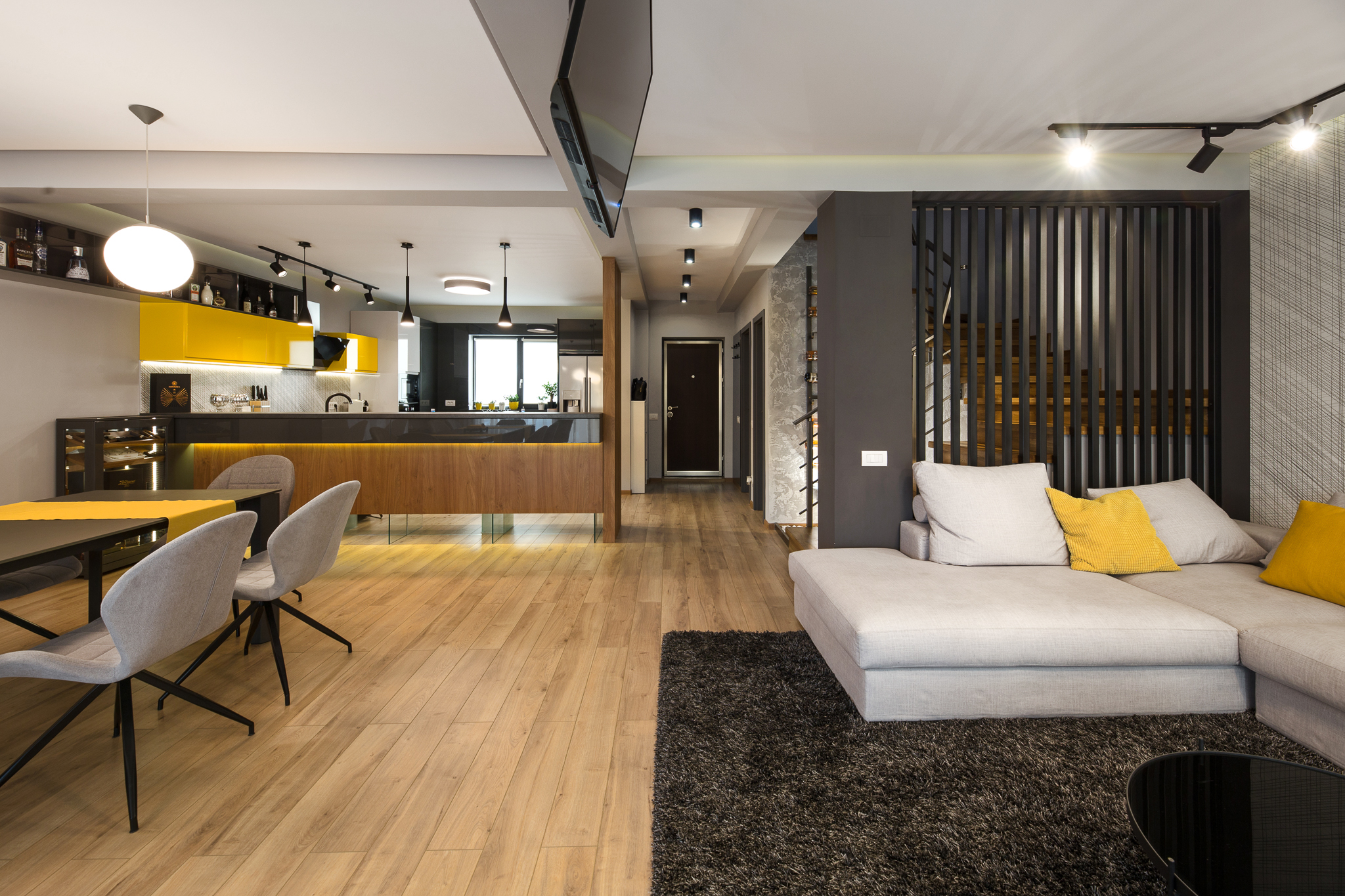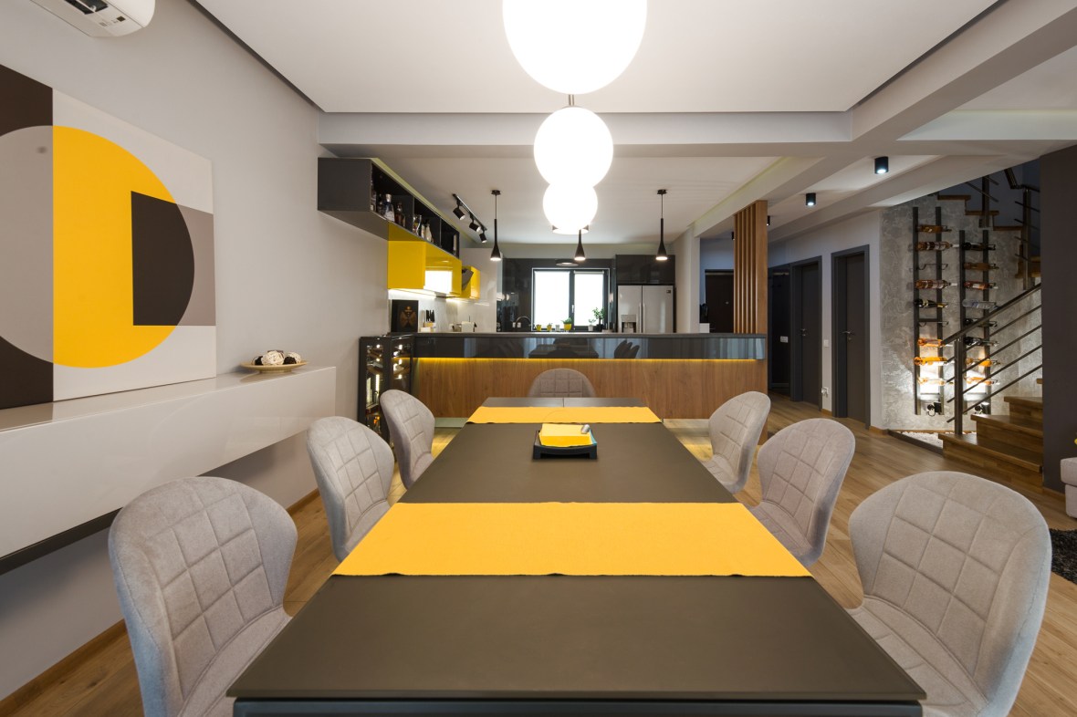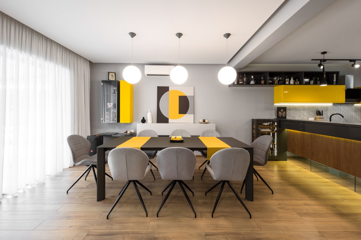 Locuința amenajată de echipa Next Interior se află într-un cartier liniștit al Bucureștiului, are 144 de metri pătrați, distribuiți pe parter și etaj și aparține unui cuplu tânăr, cu două fetițe gemene. Încă de la prima discuție cu beneficiarii echipa si-a dat seama că sunt o familie căreia îi place să socializeze, care se simt bine atunci când sunt înconjurați de prieteni, așa că le-au realizat un mediu propice pentru întâlnirile cu aceștia. S-a pornit de la paleta cromatică bazată pe nuanțe de gri pe care au ales-o împreună și au stabilit că trebuie să existe un accent de culoare: galbenul. Astfel s-a propus o amenajare fresh, contemporană, curată, dar sofisticată și spectaculoasă în același timp.