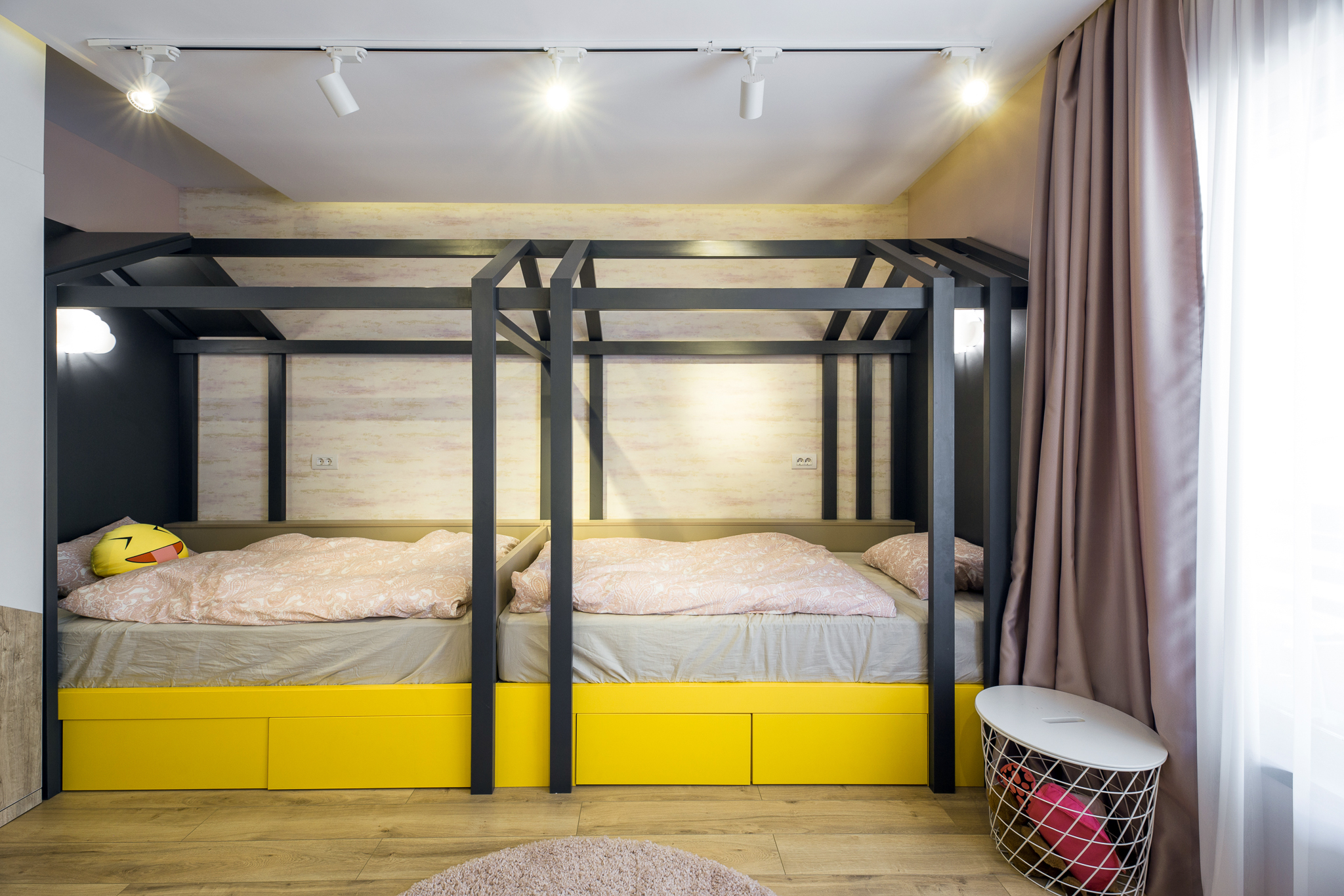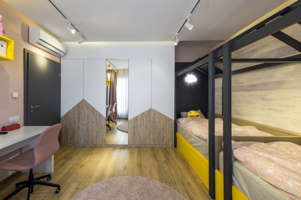 În camera fetelor am pus accentul pe zona de paturi, pe care le-am transformat în elemente scenografice tip căsuța, motiv ce se găsește și pe ușile dulapurilor. Aici am păstrat paleta cromatică, îndulcind-o totuși cu accente de roz prăfuit. Iar pentru baia fetelor am optat pentru două lavoare tip bol, cate unul pentru fiecare, și pentru o cadă freestanding, pusă în evidență de plăcile ceramice lucioase, cu aspect de marmură.