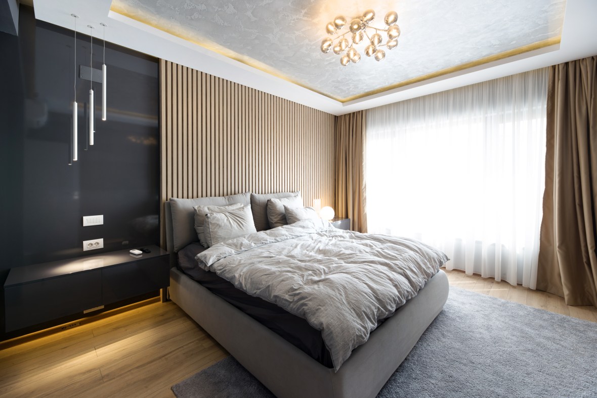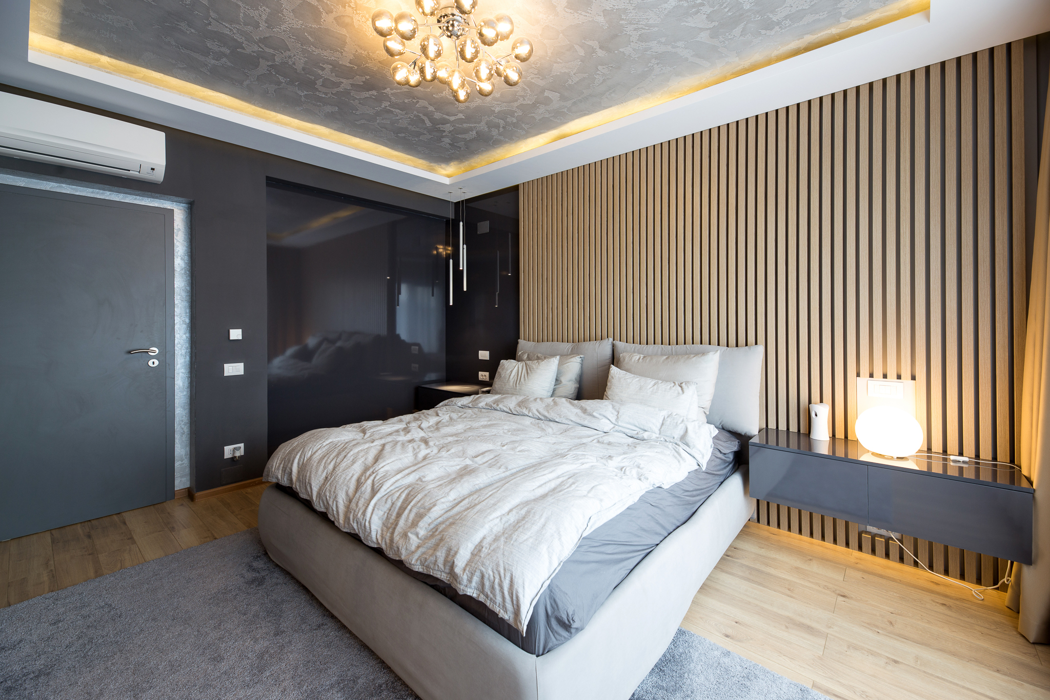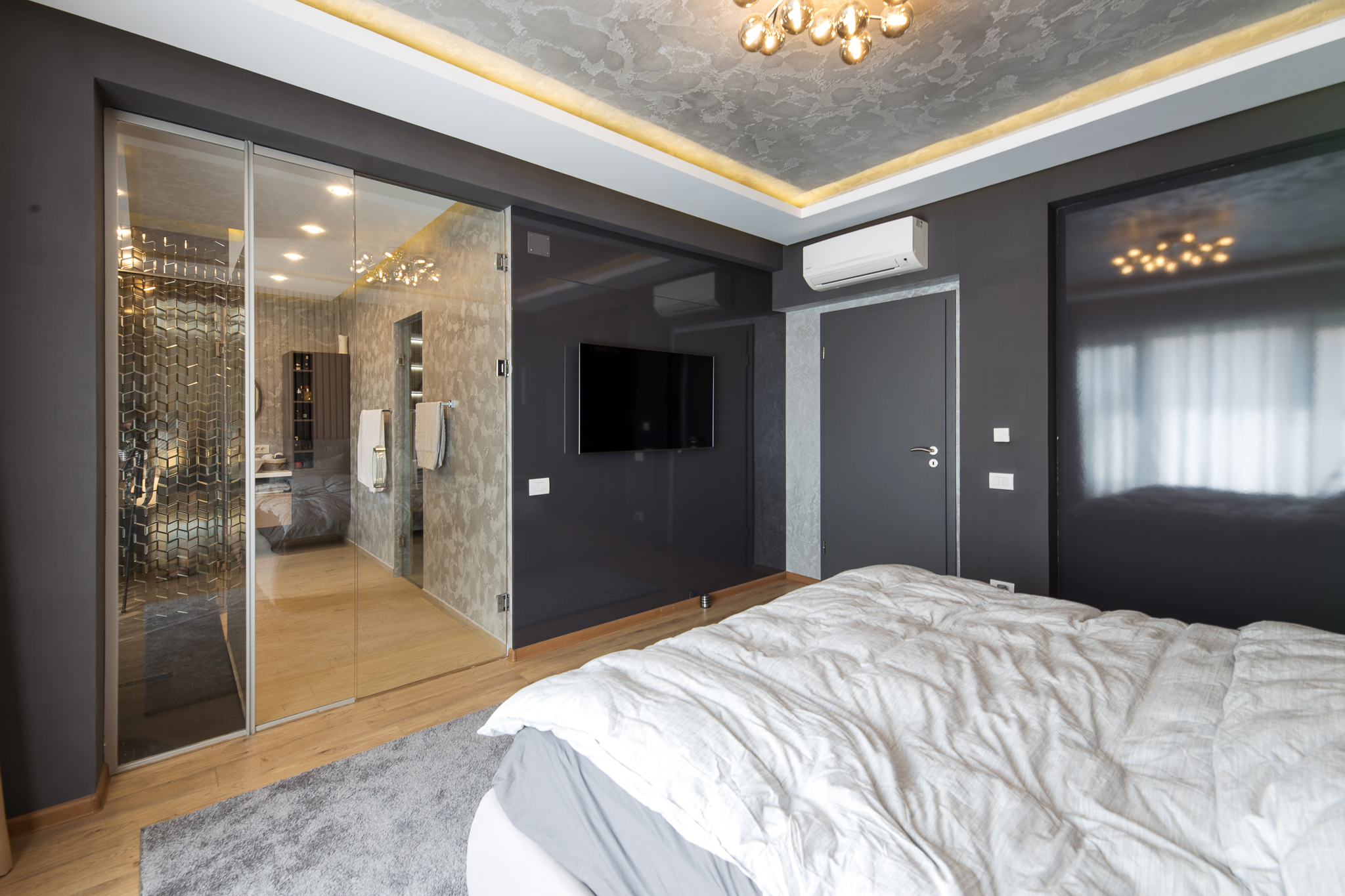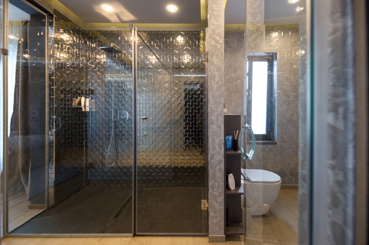 Parte din brief a făcut și faptul că beneficiarii își doreau un dormitor matrimonial wow, cu vedere către baie. Soluția noastră a fost să creăm un decor scenografic, prin numeroasele suprafețe lucioase și utilizând mai multe surse de iluminat. Zona dușului din baia matrimoniala este complet vitrată către dormitor, și pentru a continua motivul reflexiilor, am ales pentru pereții dușului plăci cu forme geometrice cu aspect de oglindă.