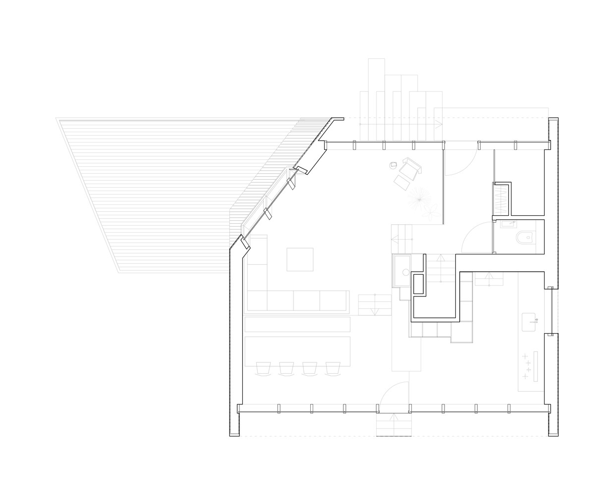Tot spatiul interior este rezolvat simplu prin jocul cotei de calcare, unde spatiile de interior sunt cu un pas mai inalte fata de celelalte. Acest artificiu creeaza o separare a spatiului interior la nivel fizic, dar care la nivel vizual se prezinta ca un spatiu continuu.